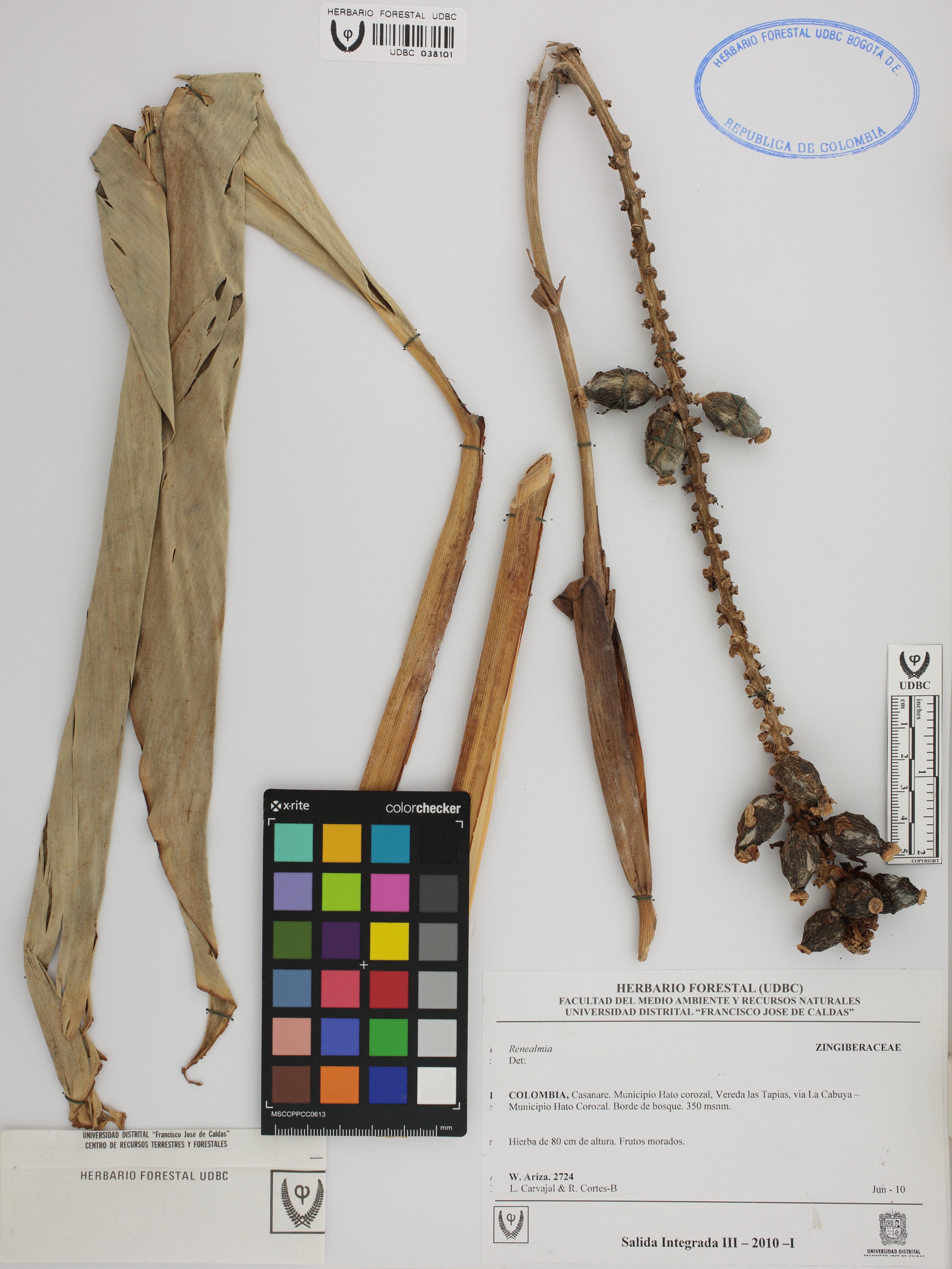 Fotografía del ejemplar Ariza, W. 2724, determinado como Renealmia sp.