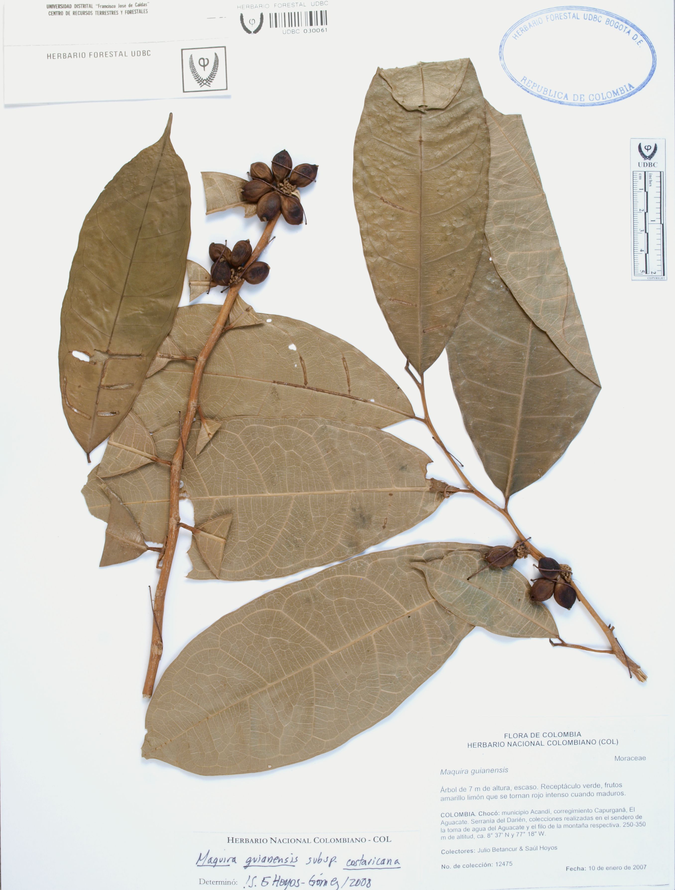 Fotografía del ejemplar Betancur, J. 12475, determinado como Maquira guianensis en el año 2008