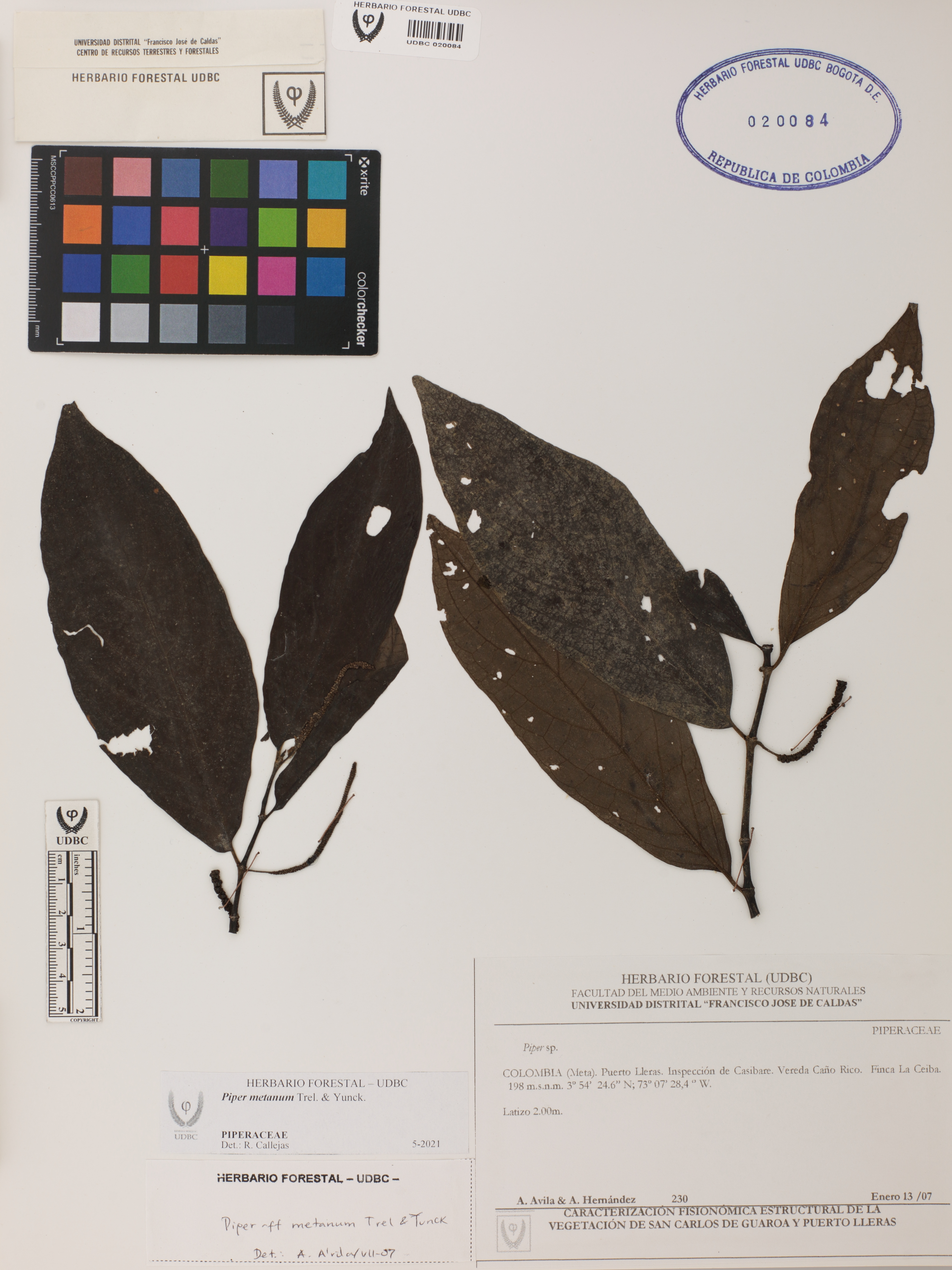 Fotografía del ejemplar Ávila, A. 230, determinado como Piper metanum en el año 2021