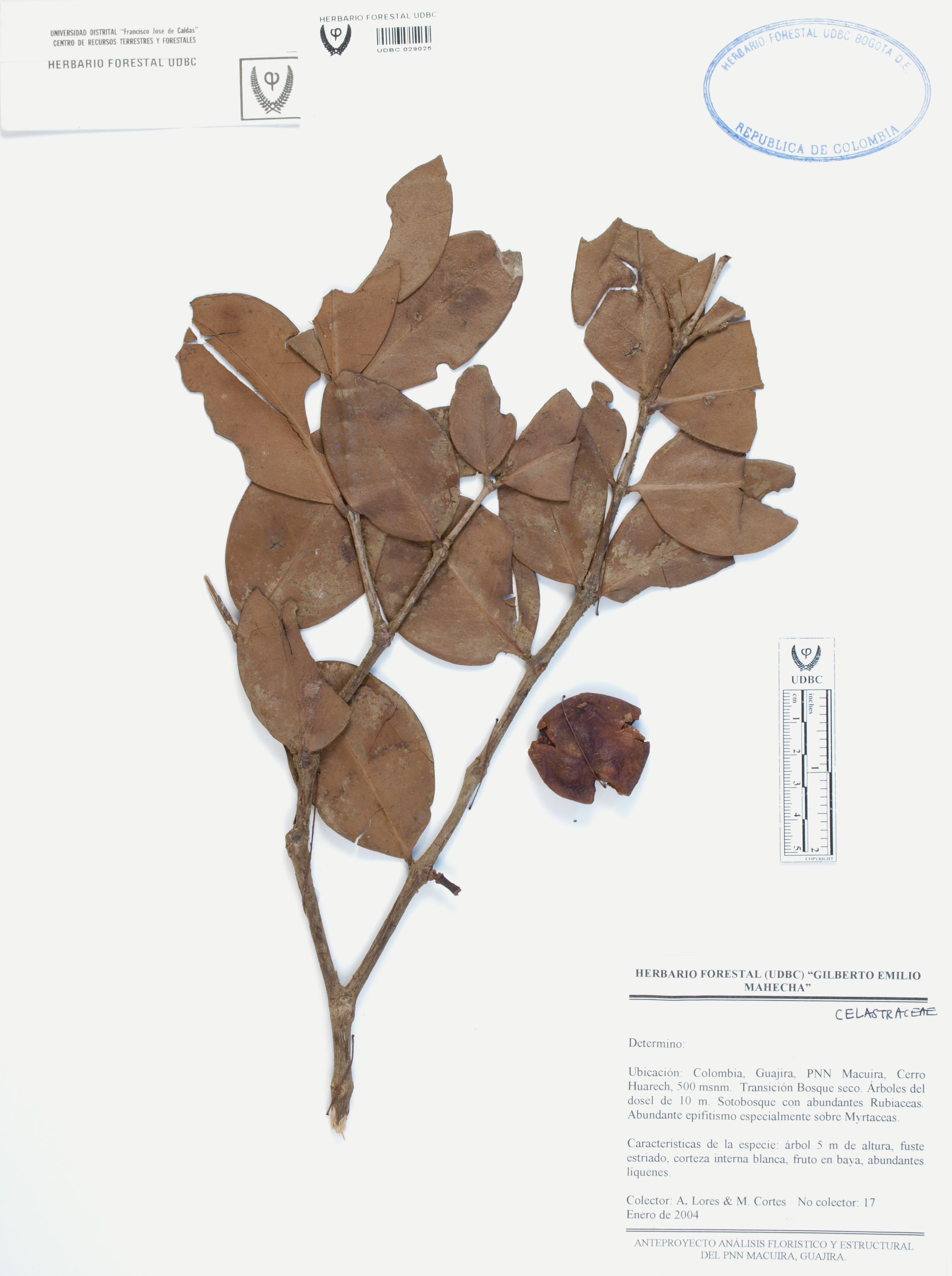 Fotografía del ejemplar Lores, A. 17, determinado como Celastraceae