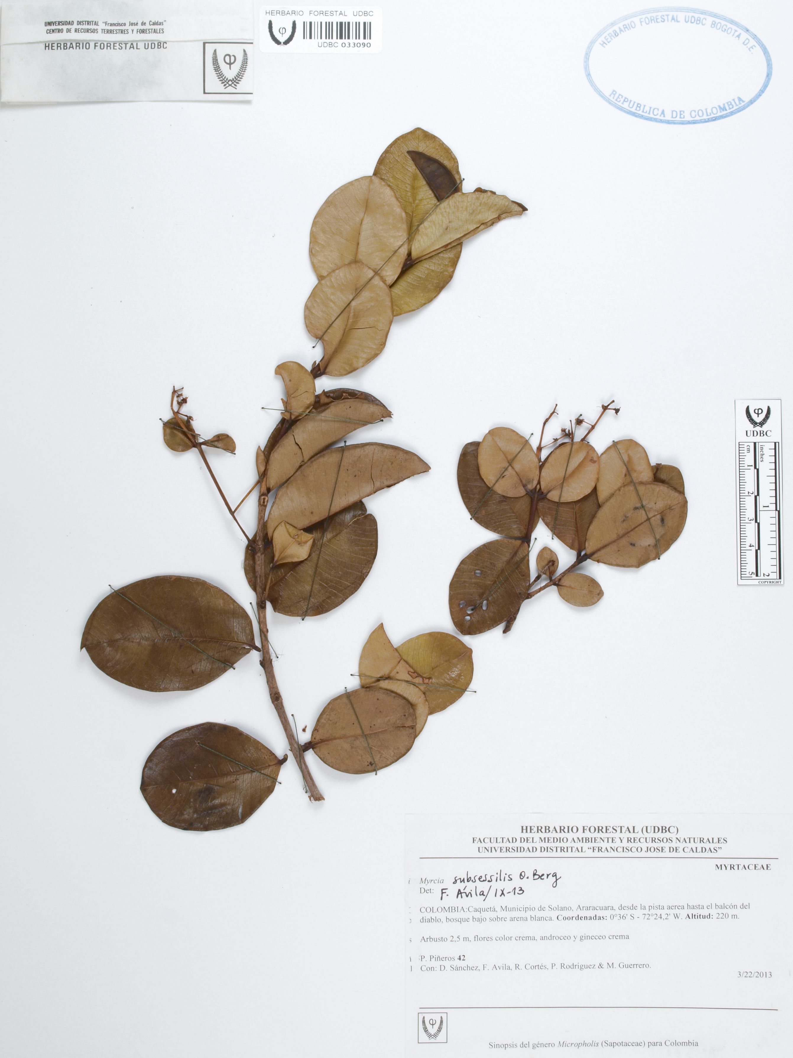Fotografía del ejemplar Piñeros, P. 42, determinado como Myrcia subsessilis en el año 2013