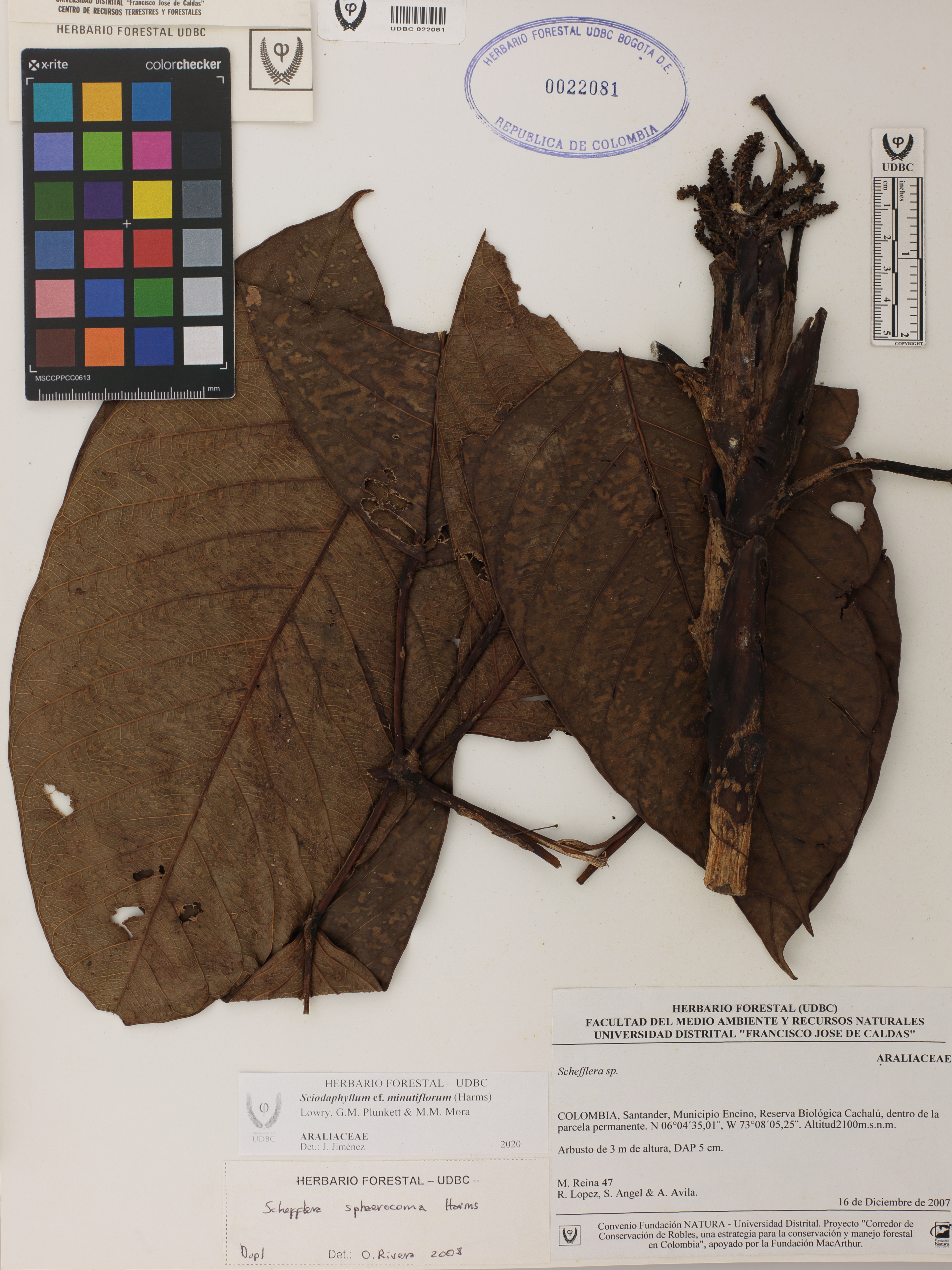 | dc.description | Fotografía del ejemplar Reina, M. 47, determinado como Sciodaphyllum minutiflorum en el año 2020 | |