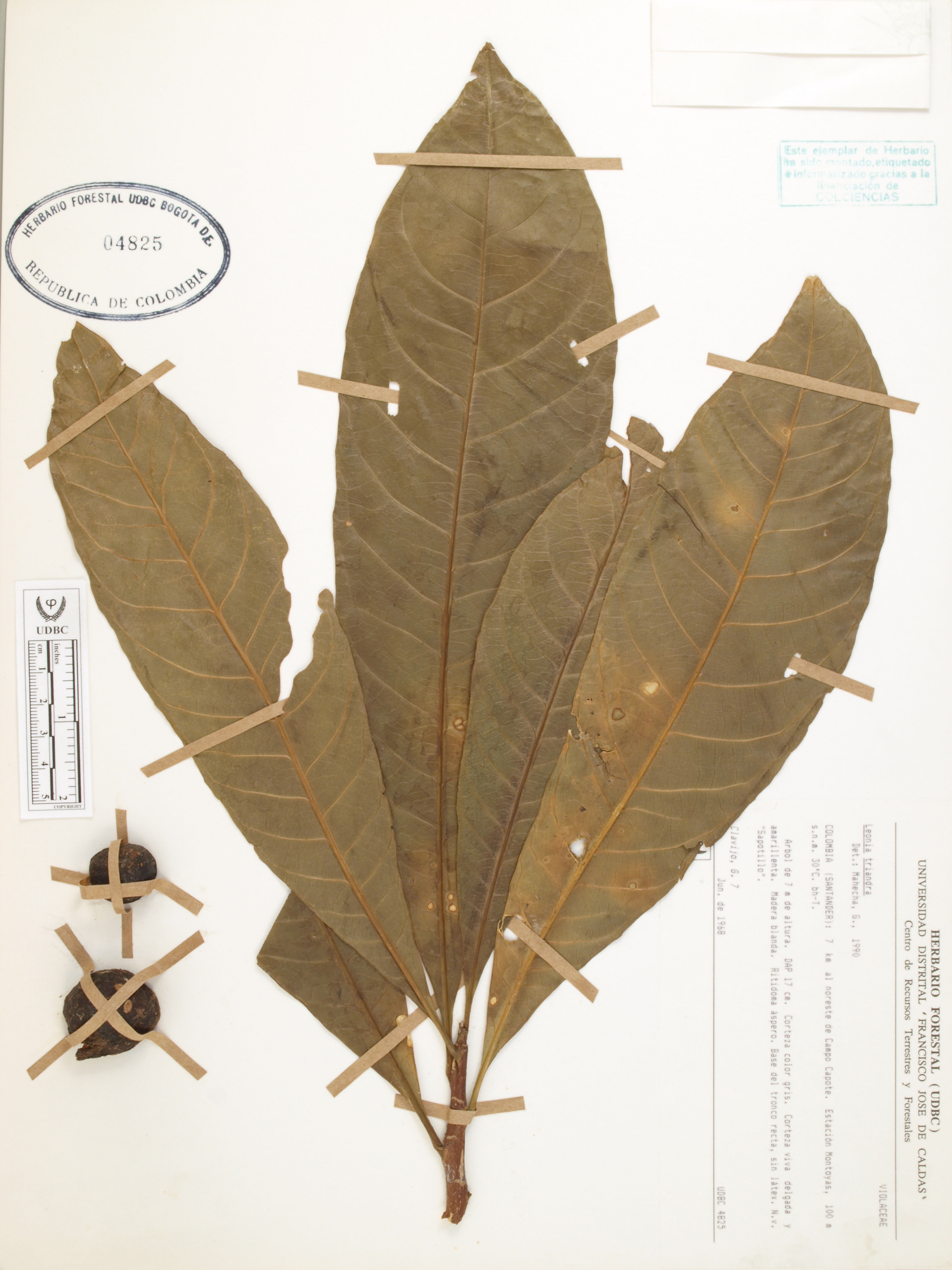 Fotografía del ejemplar Clavijo, G. 7, determinado como Leonia triandra en el año 1990