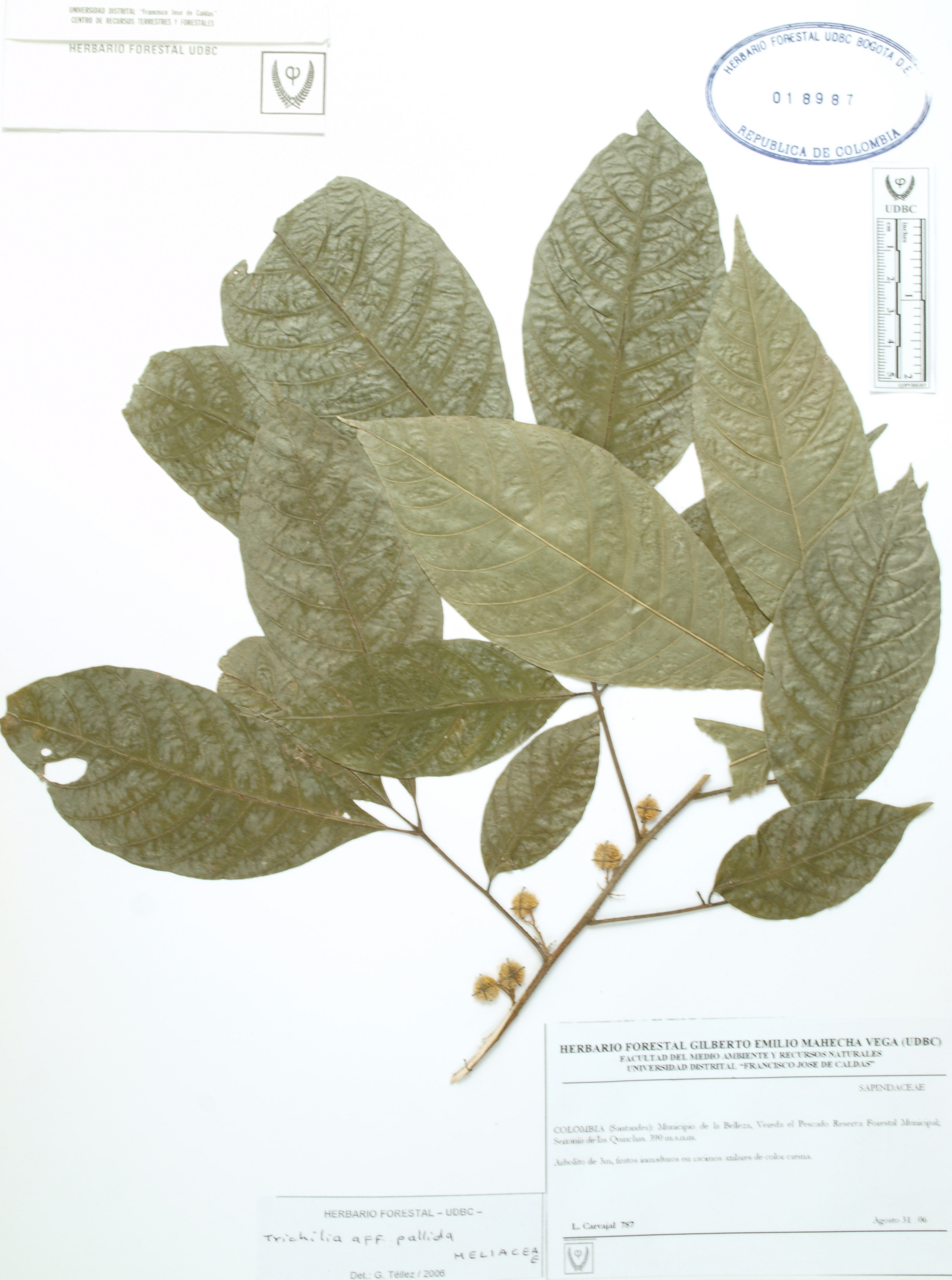 Fotografía del ejemplar Carvajal, L. 787, determinado como Trichilia pallida en el año 2006