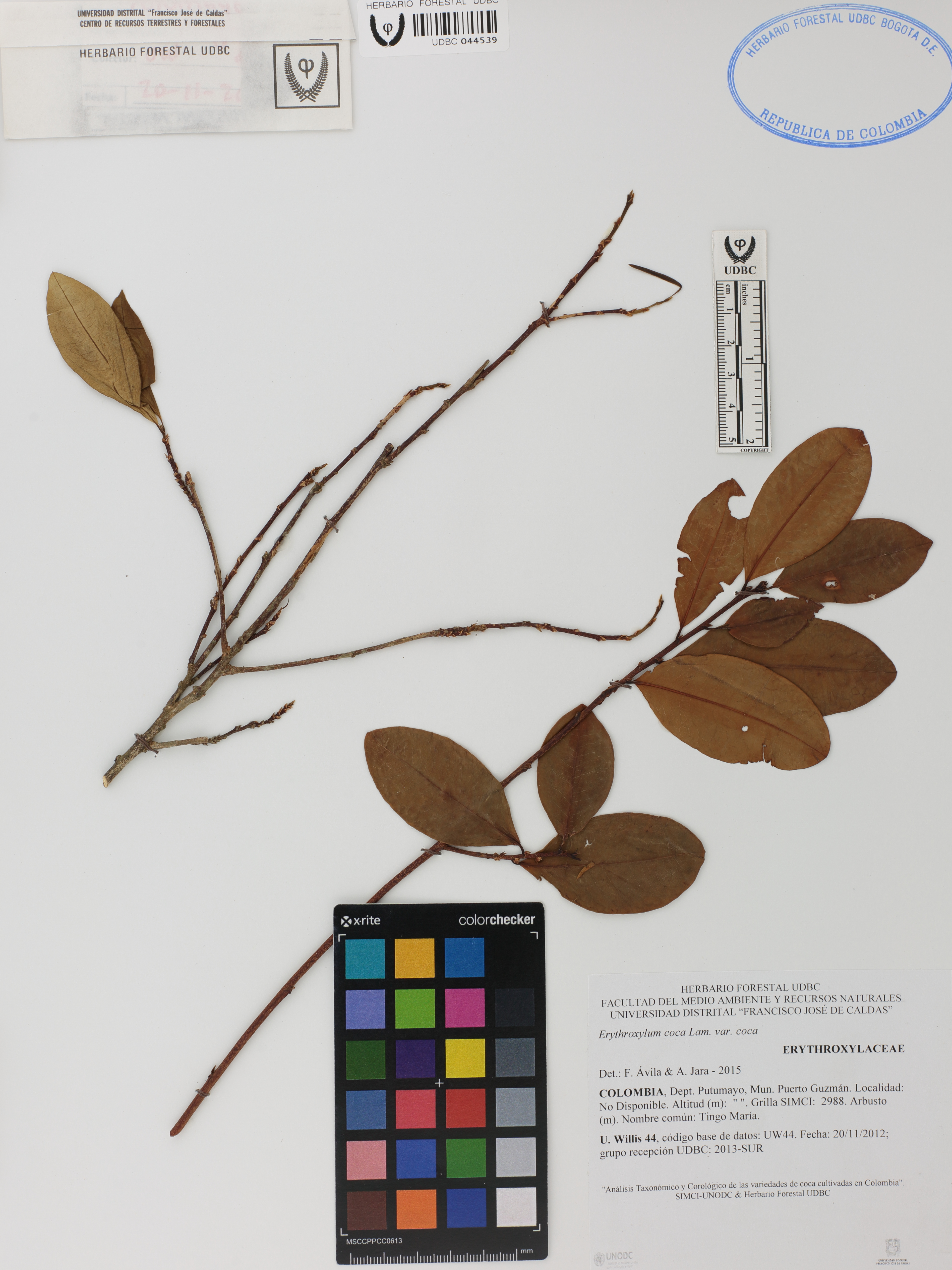 | dc.description | Fotografía del ejemplar Willis, U. 44, determinado como Erythroxylum coca var. coca en el año 2015 | |