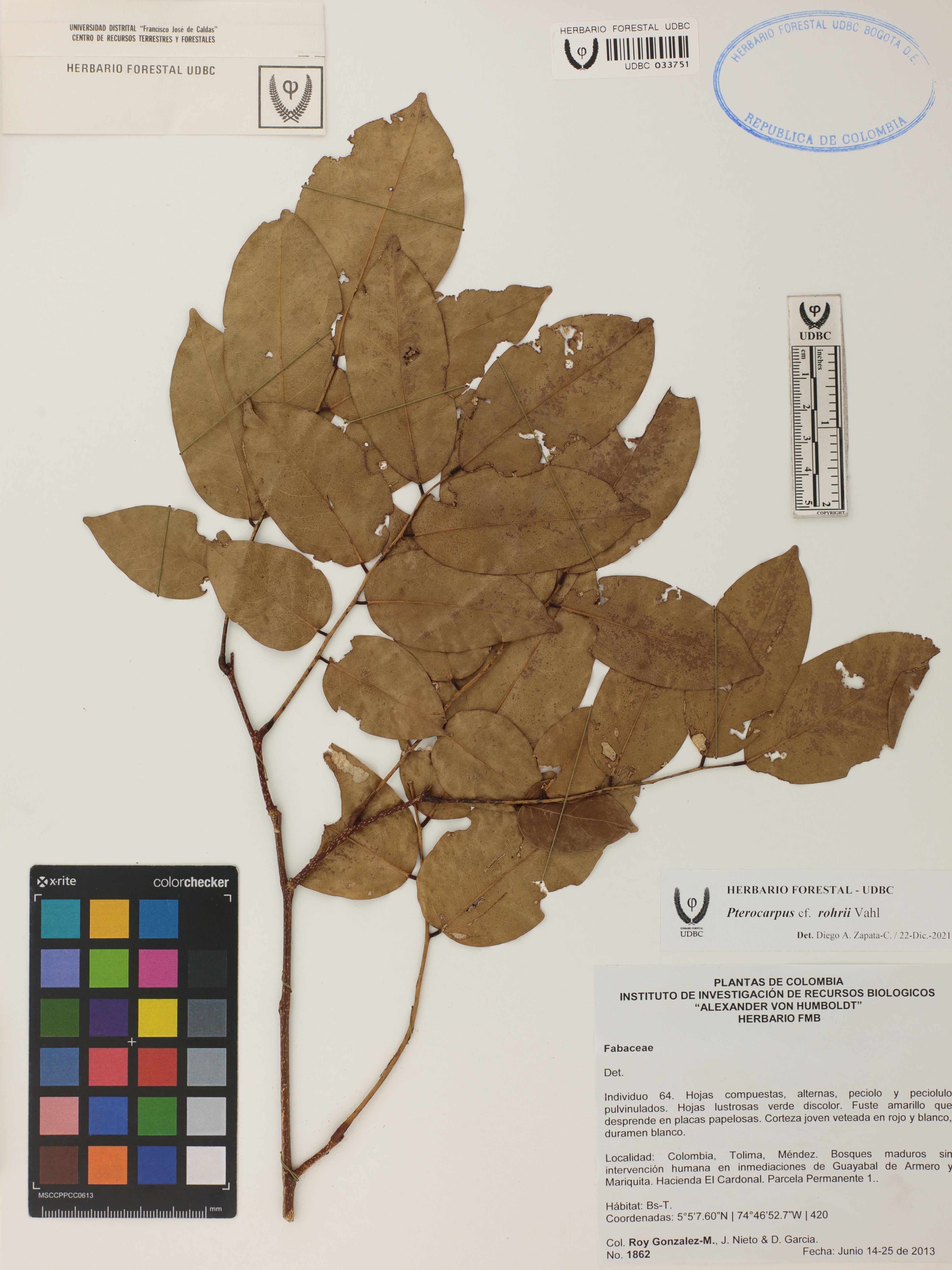 Fotografía del ejemplar González-M., R. 1862, determinado como Pterocarpus rohrii en el año 2021