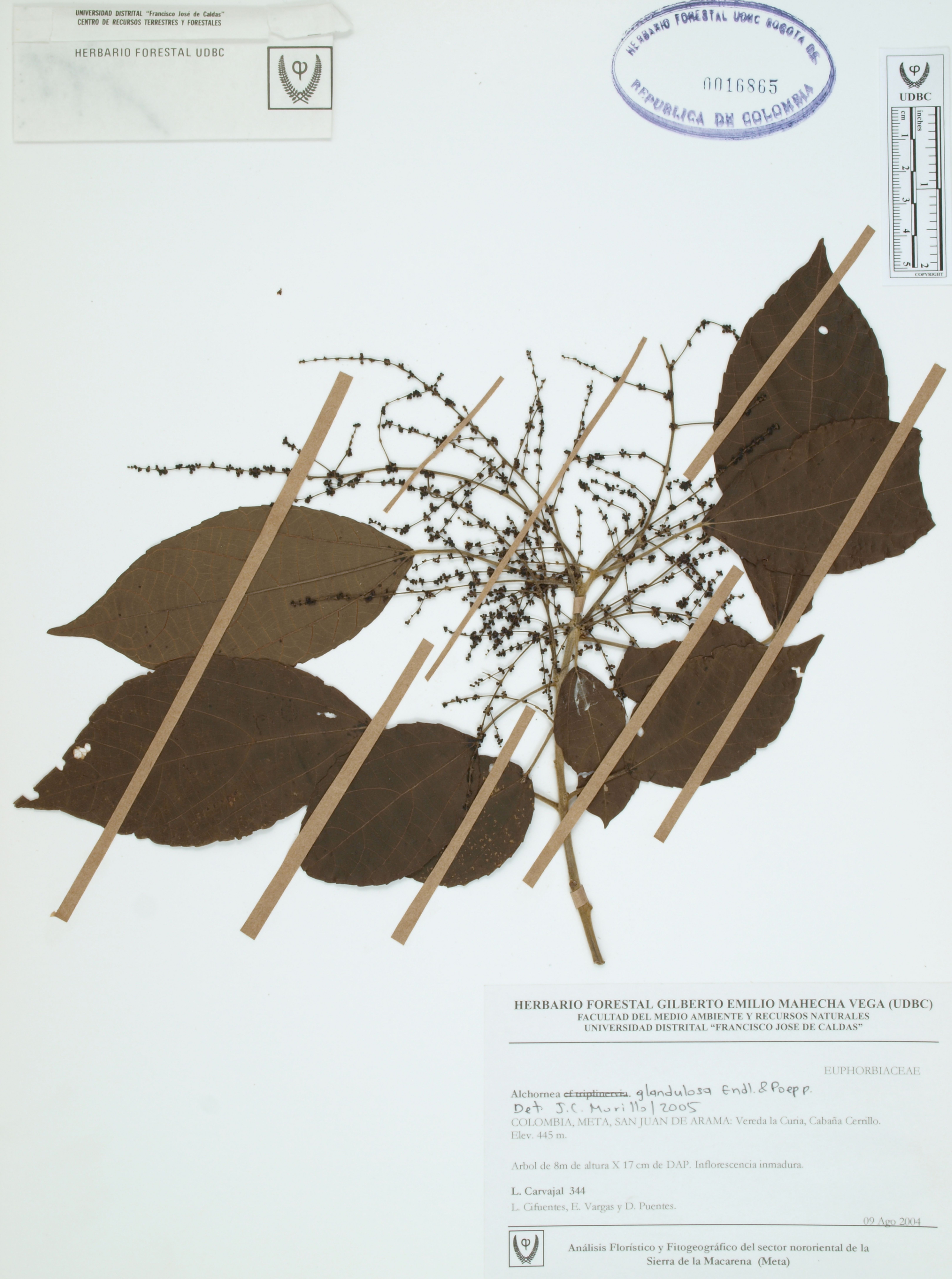 Fotografía del ejemplar Carvajal, L. 344, determinado como Alchornea glandulosa en el año 2005