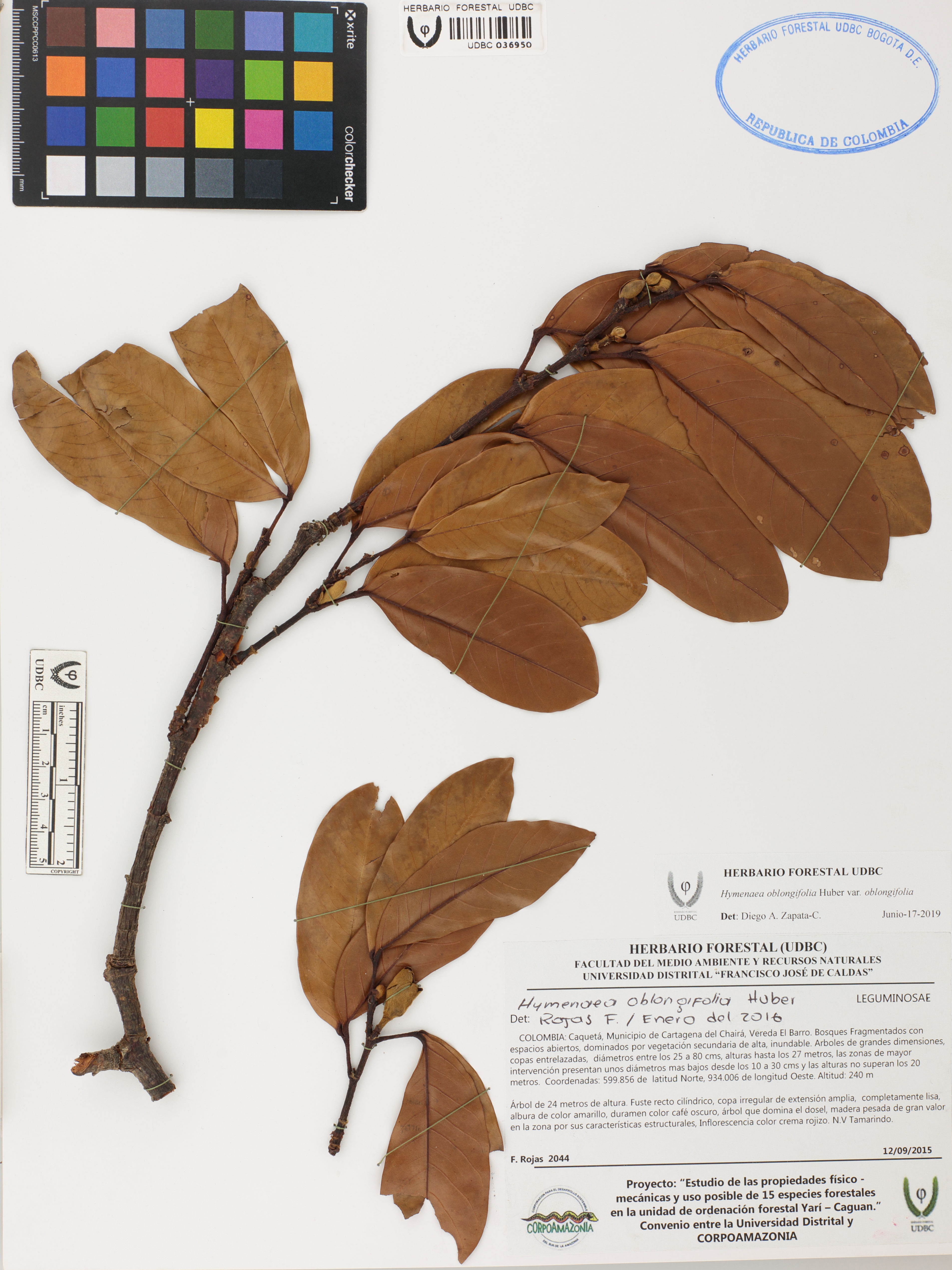 Fotografía del ejemplar Rojas, F. 2044, determinado como Hymenaea oblongifolia var. oblongifolia en el año 2019