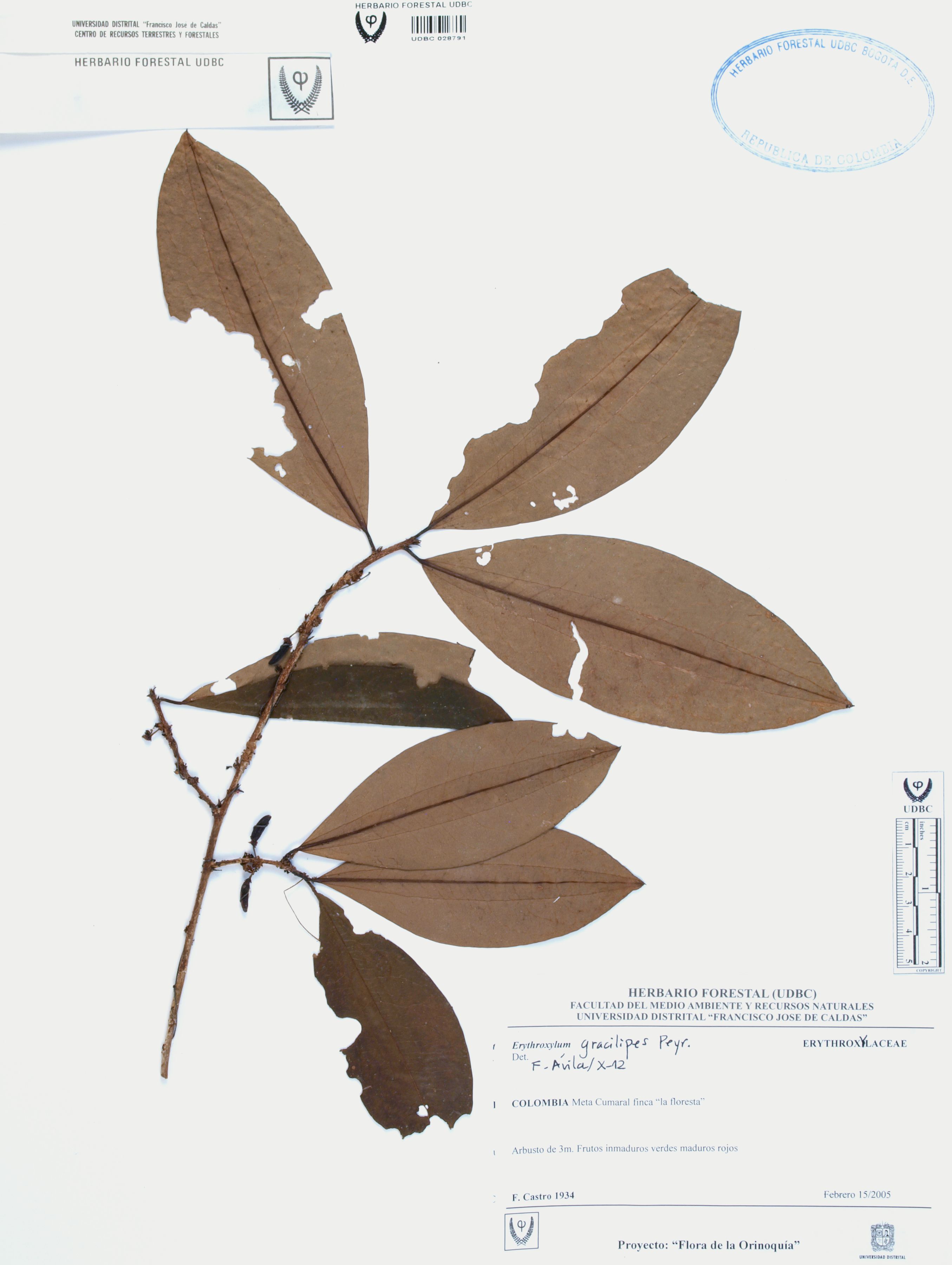 | dc.description | Fotografía del ejemplar Castro, F. 1934, determinado como Erythroxylum gracilipes en el año 2012 | |
