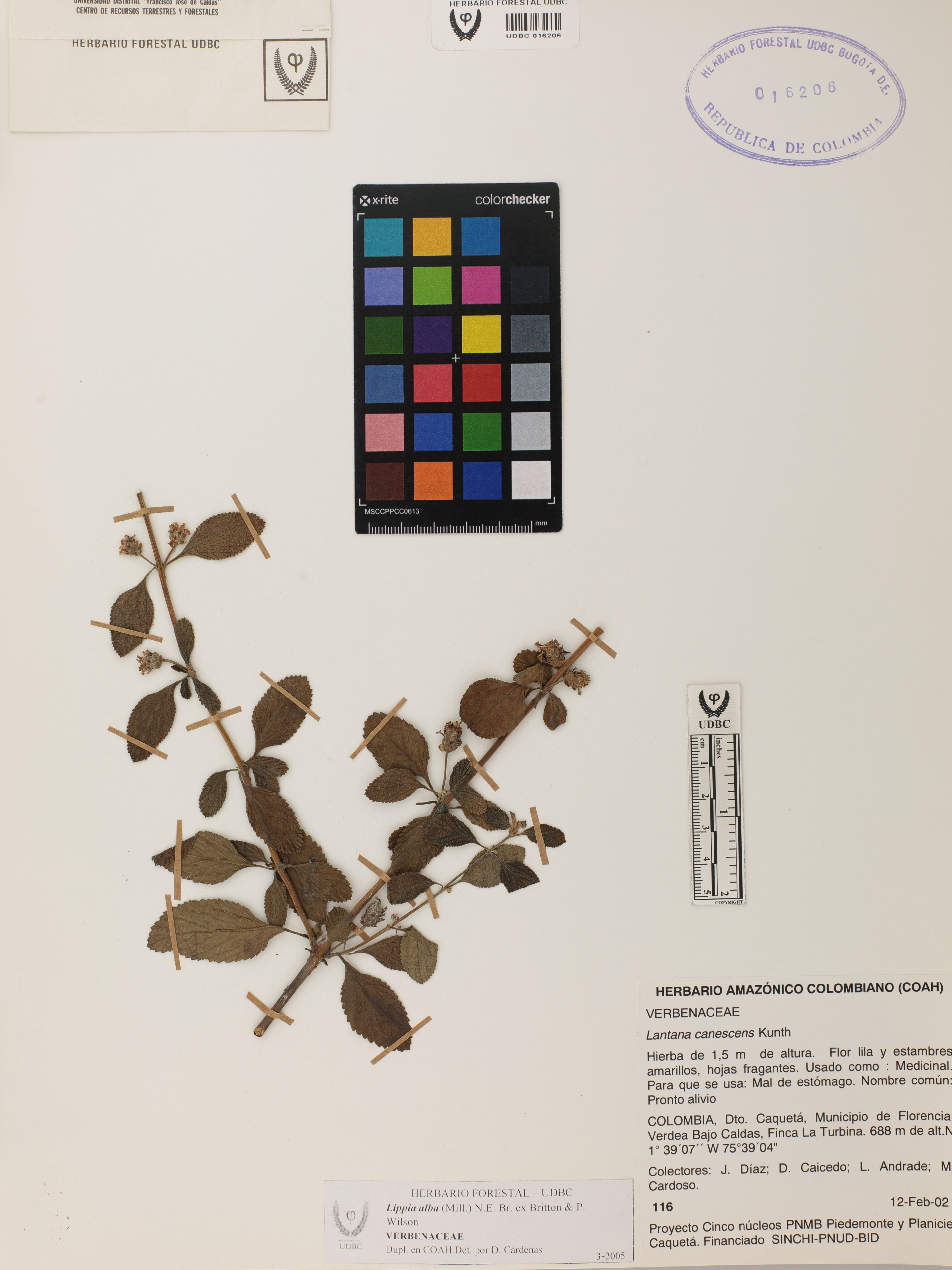 Fotografía del ejemplar Díaz, J. 116, determinado como Lippia alba en el año 2005