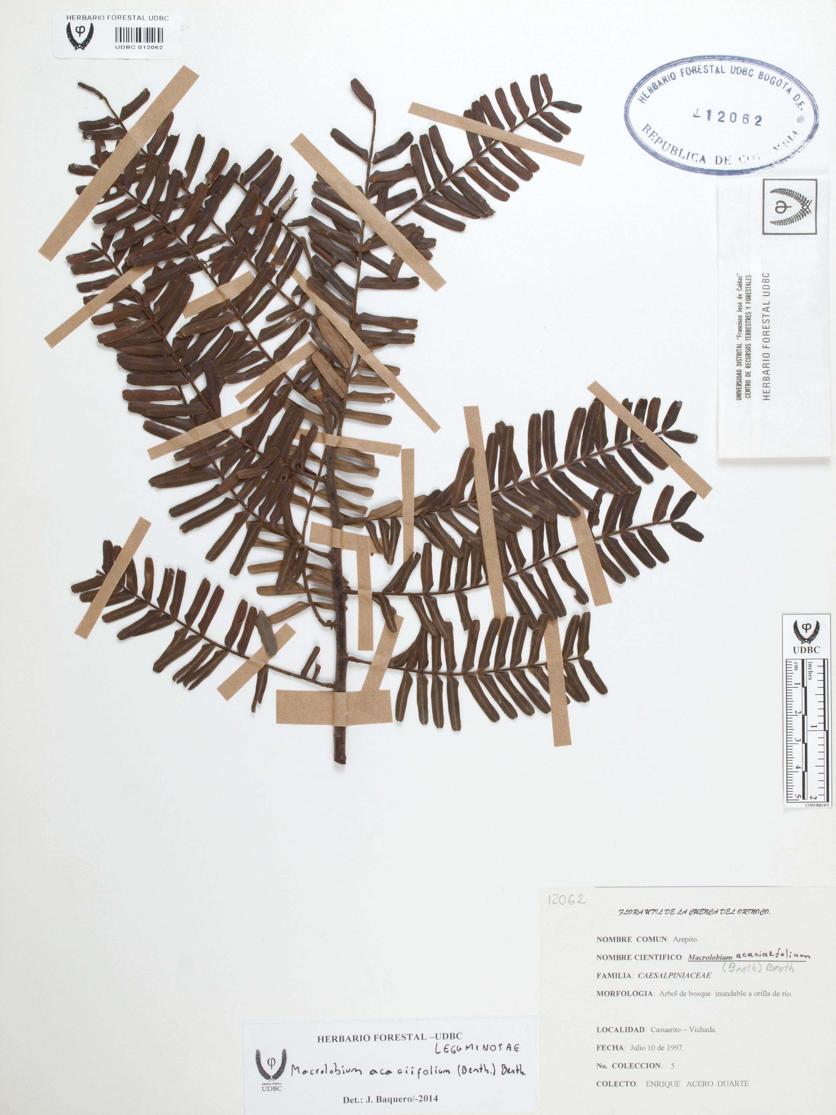 Fotografía del ejemplar Acero, E. 5, determinado como Macrolobium acaciifolium en el año 2014