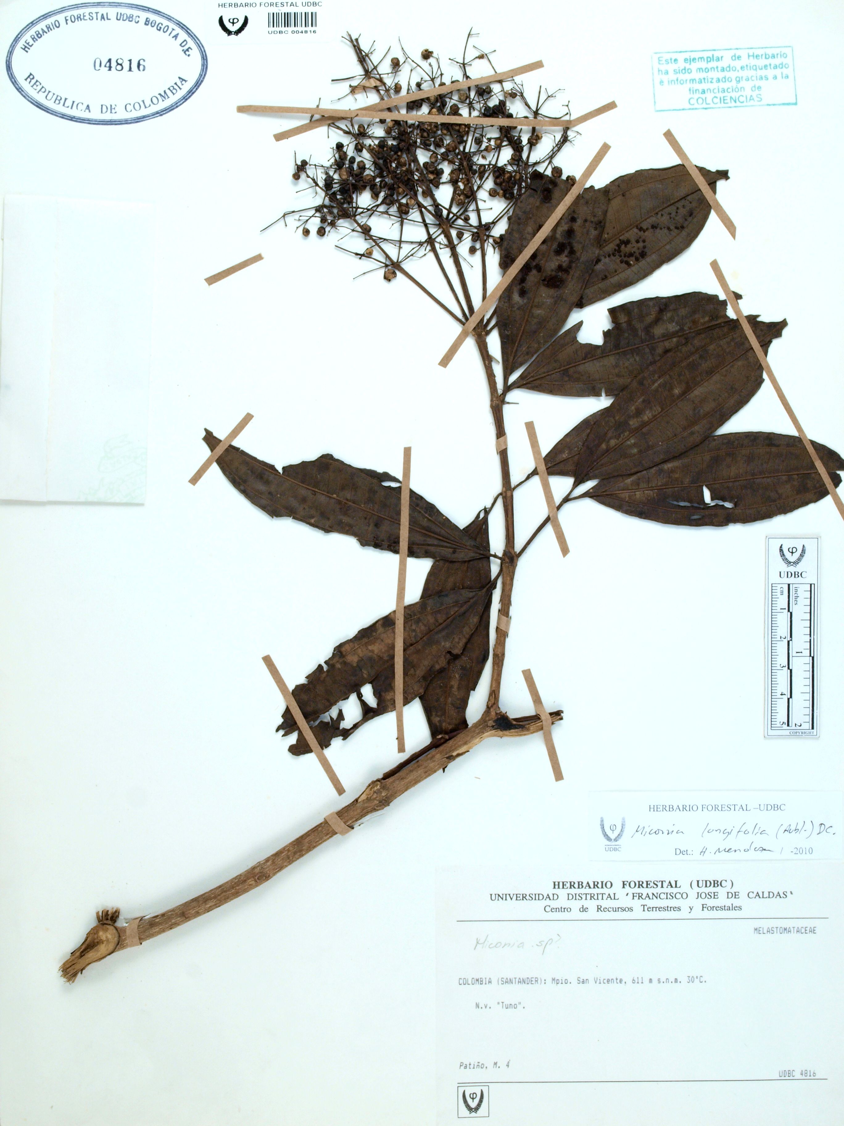 | dc.description | Fotografía del ejemplar Patiño, M. 4, determinado como Miconia longifolia en el año 2010 | |