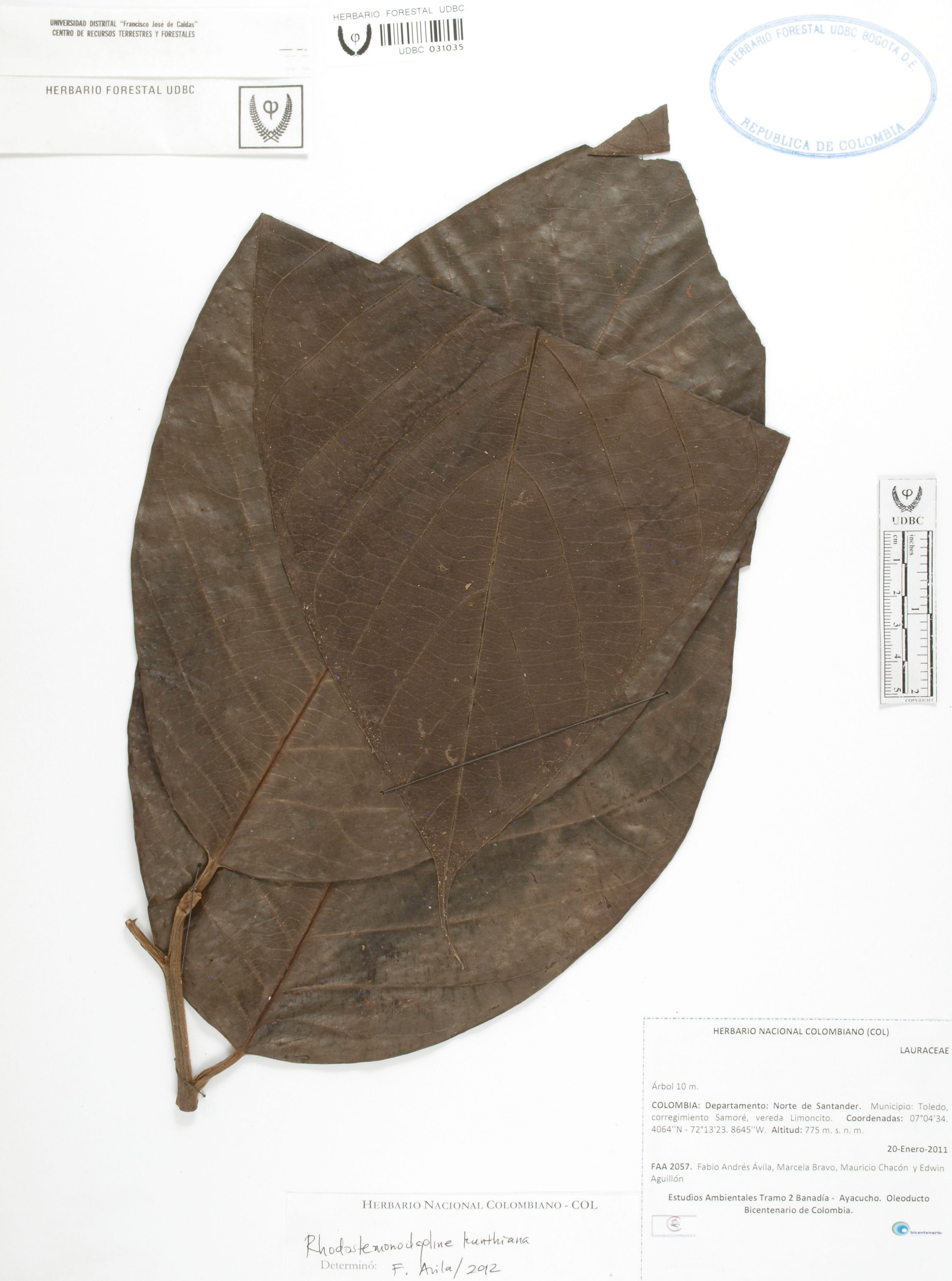 Fotografía del ejemplar Ávila, F. 2057, determinado como Rhodostemonodaphne kunthiana en el año 2012