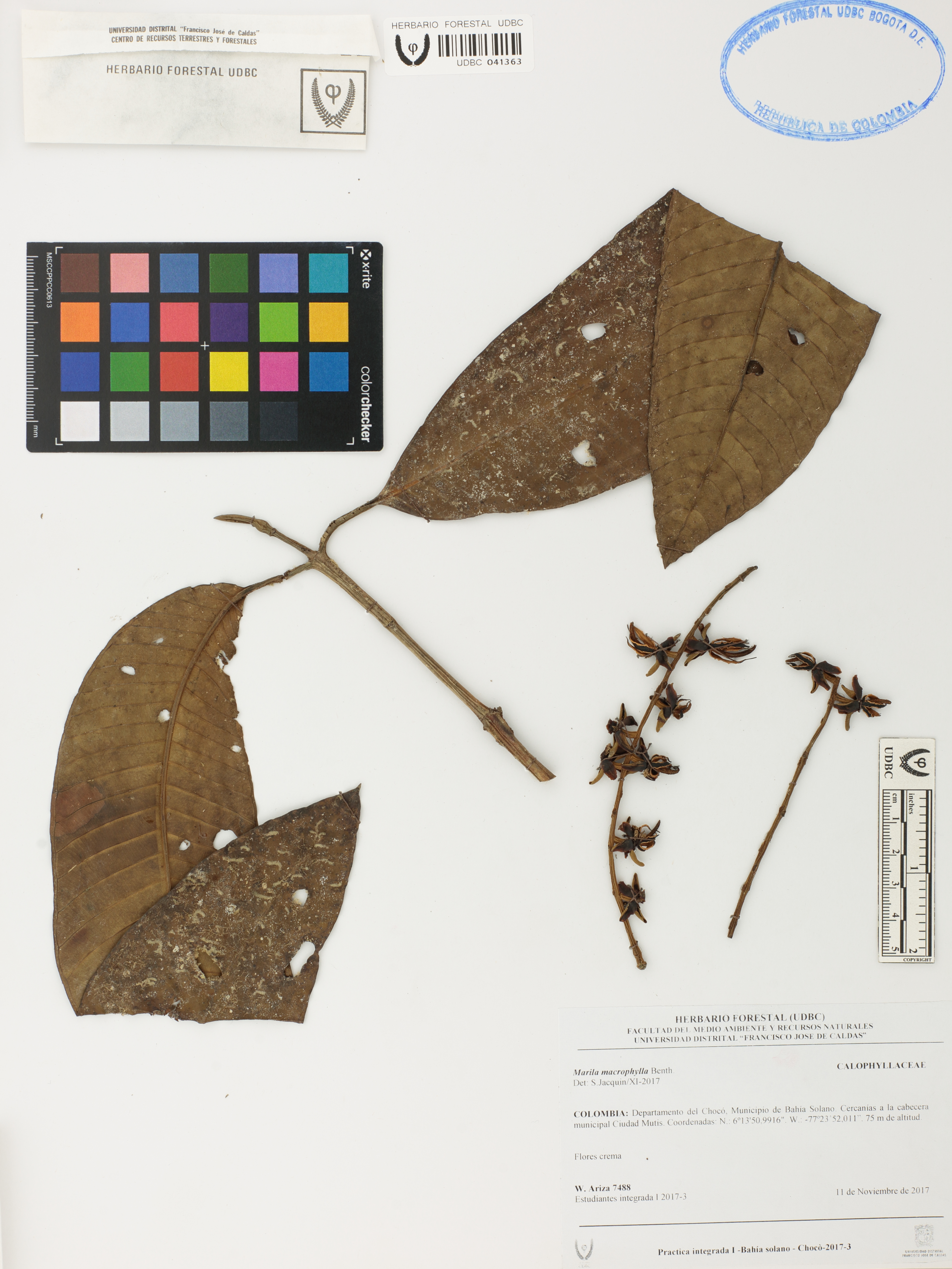 Fotografía del ejemplar Ariza, W. 7488, determinado como Marila macrophylla en el año 2017