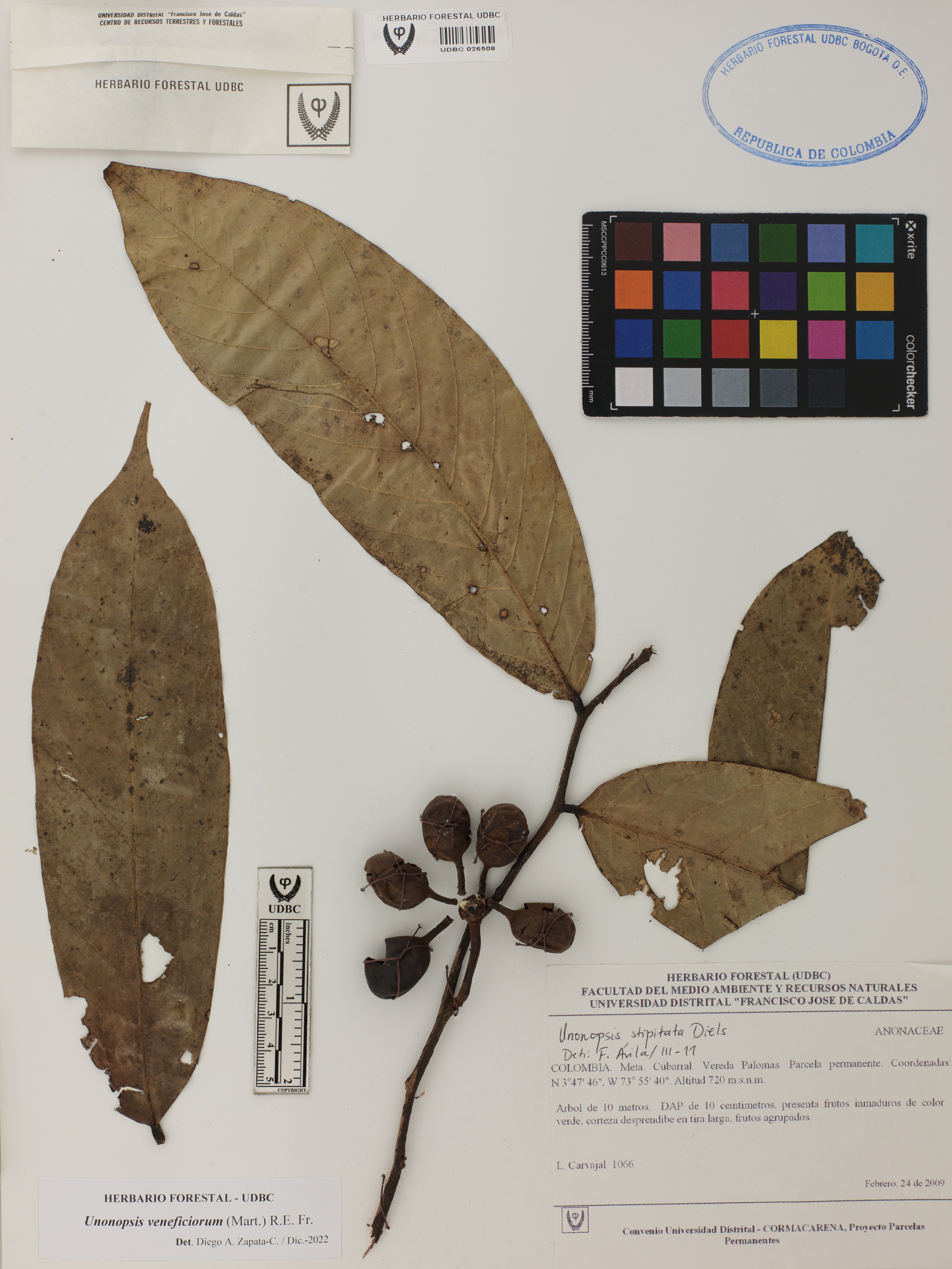 Fotografía del ejemplar Carvajal, L. 1066, determinado como Unonopsis veneficiorum en el año 2022