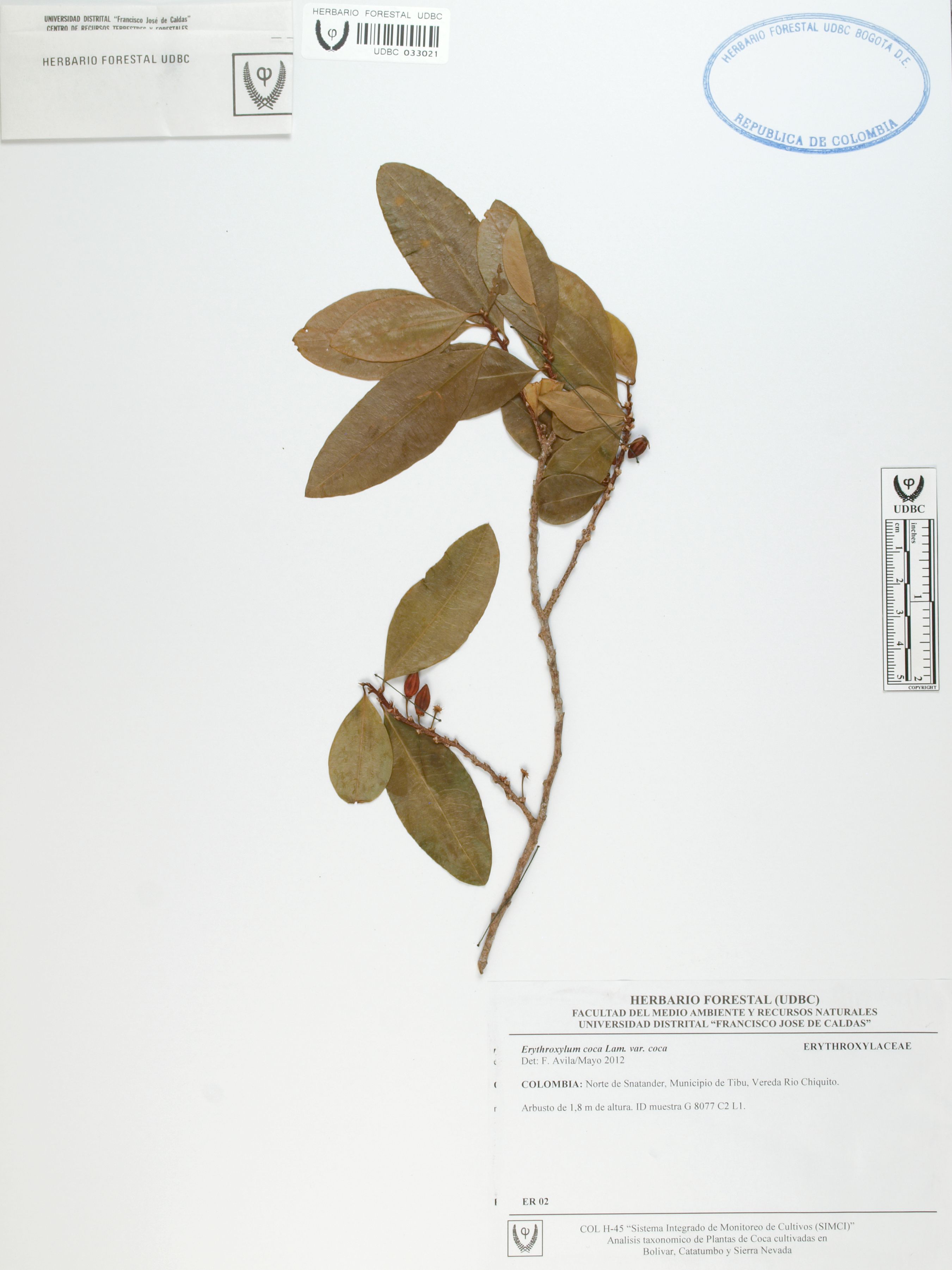 Fotografía del ejemplar SD 2, determinado como Erythroxylum coca var. coca en el año 2012