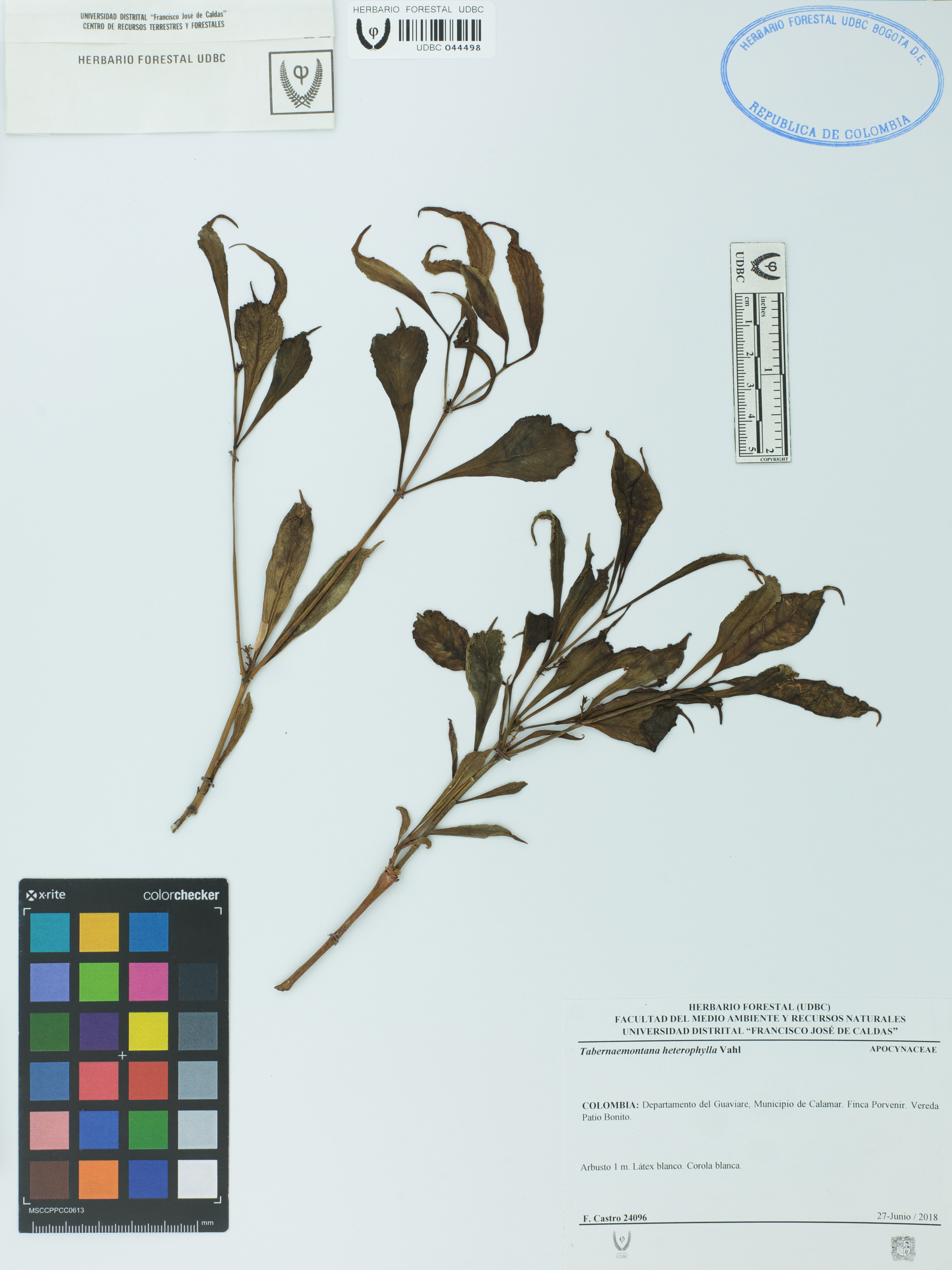 Fotografía del ejemplar Castro, F. 24096, determinado como Tabernaemontana heterophylla en el año 2018