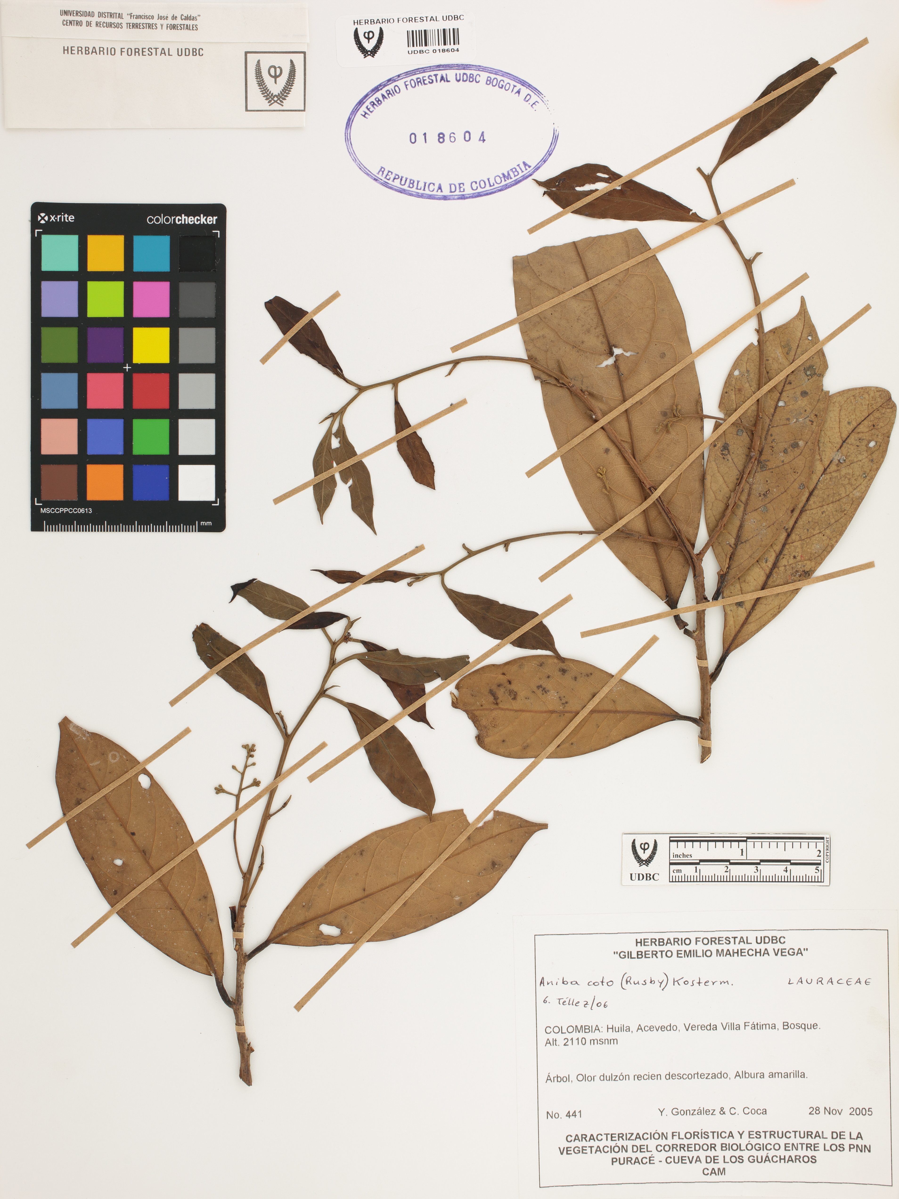 Fotografía del ejemplar González, Y. 441, determinado como Aniba coto en el año 2006