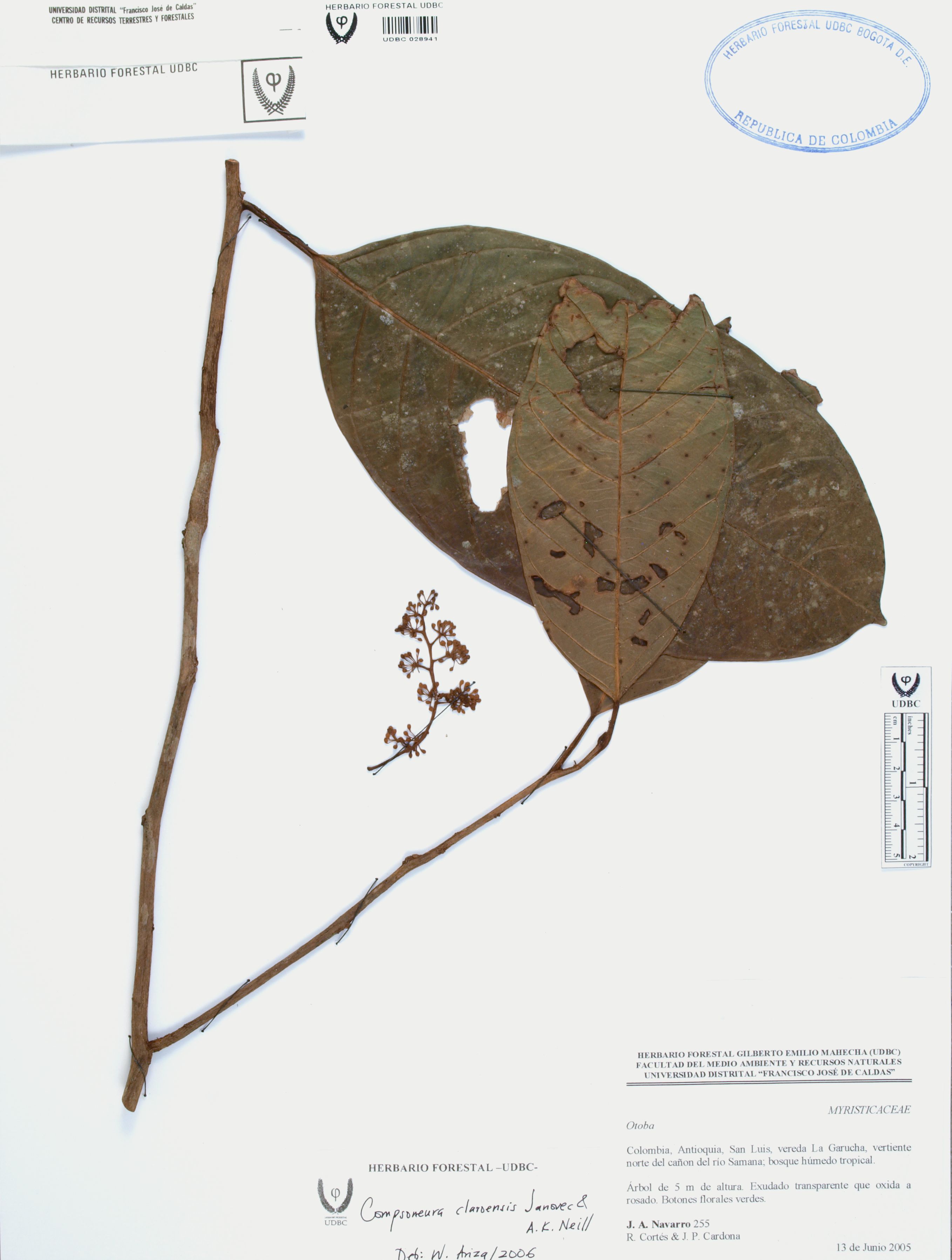 Fotografía del ejemplar Navarro, J. 255, determinado como Compsoneura claroensis en el año 2006