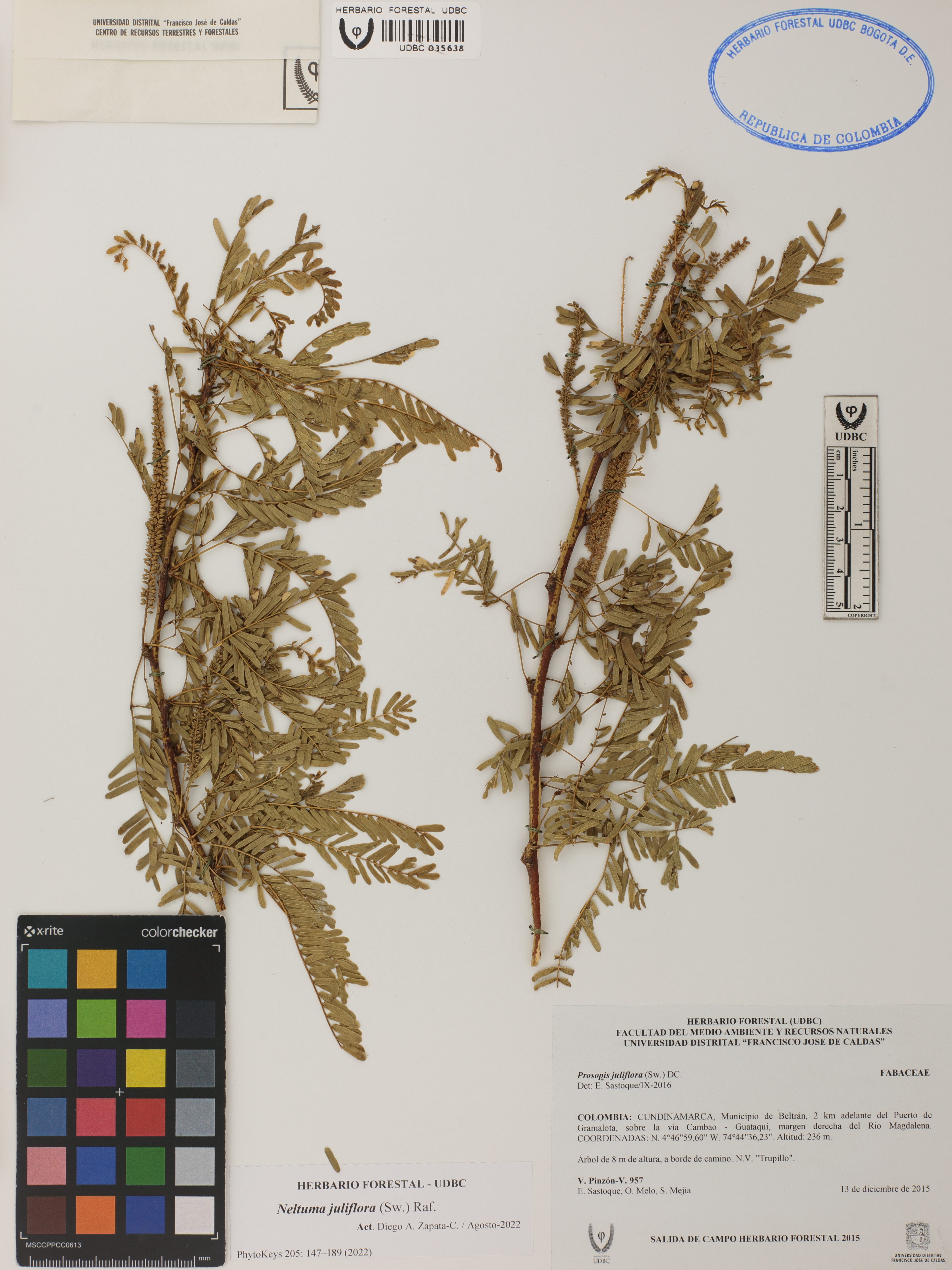 Fotografía del ejemplar Pinzón-V., V. 957, determinado como Neltuma juliflora en el año 2016