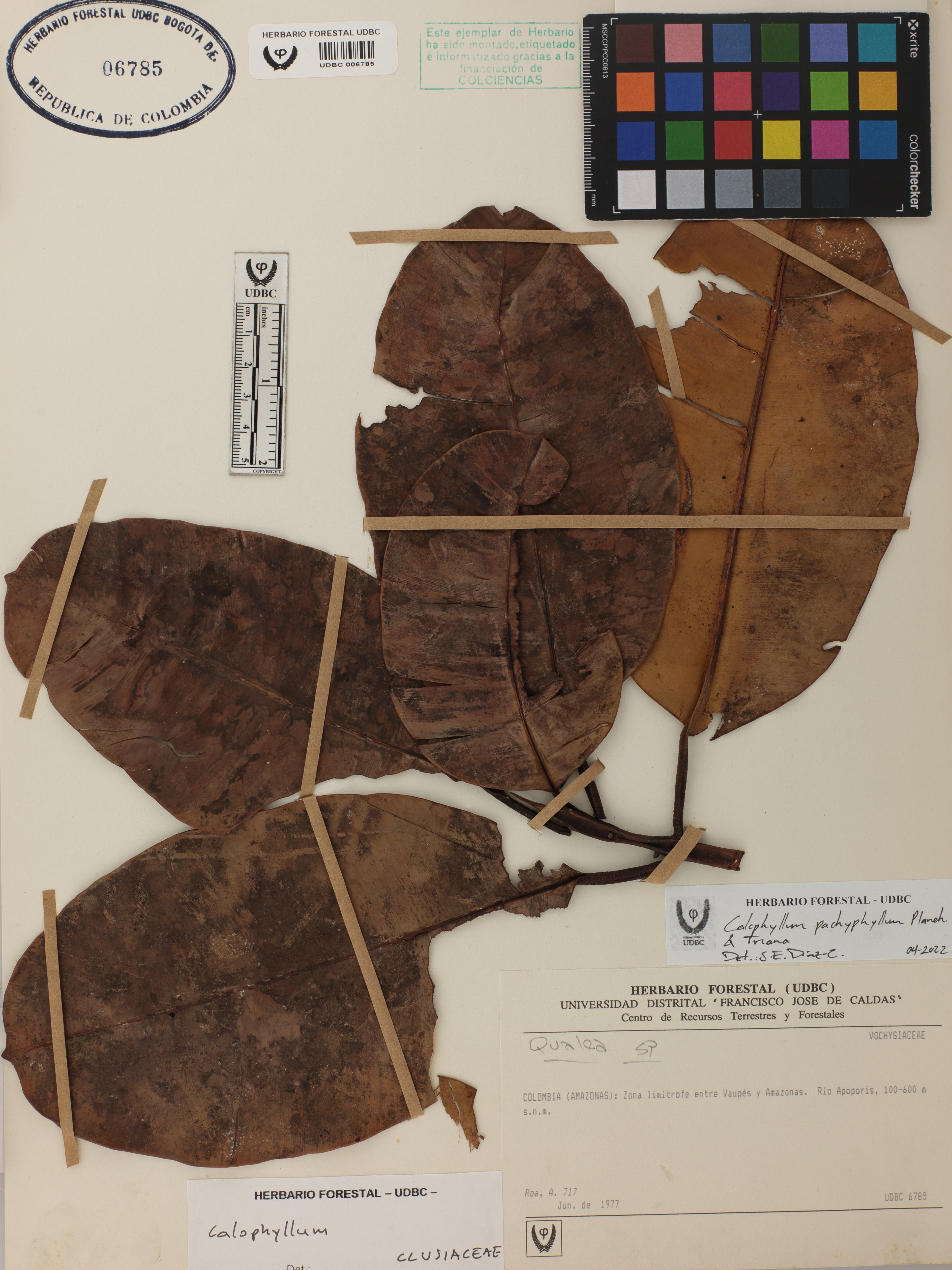 Fotografía del ejemplar Roa, A. 717, determinado como Calophyllum pachyphyllum en el año 2022