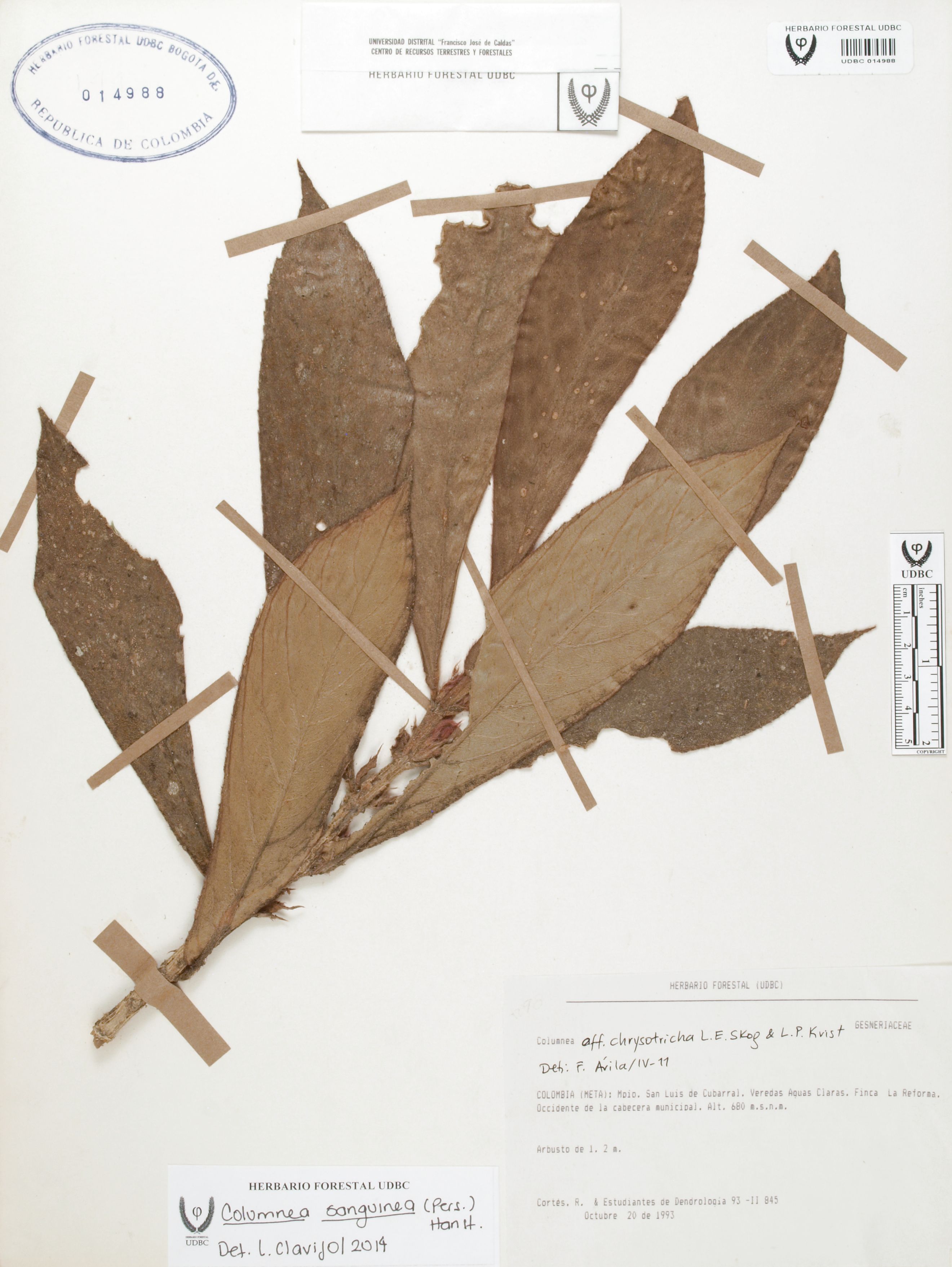 Fotografía del ejemplar Cortés, R. 845, determinado como Columnea sanguinea en el año 2014