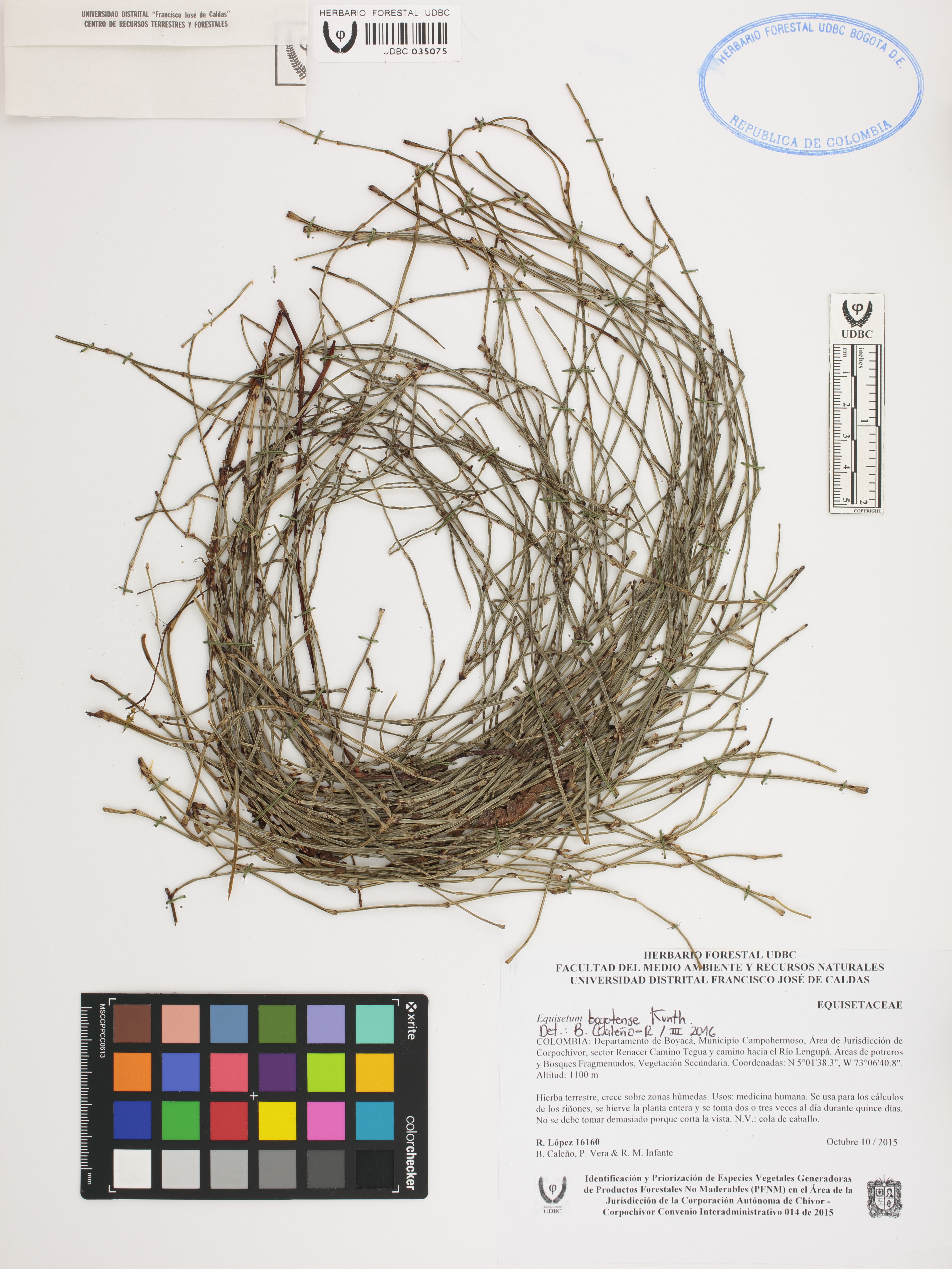 Fotografía del ejemplar López, R. 16160, determinado como Equisetum bogotense en el año 2016