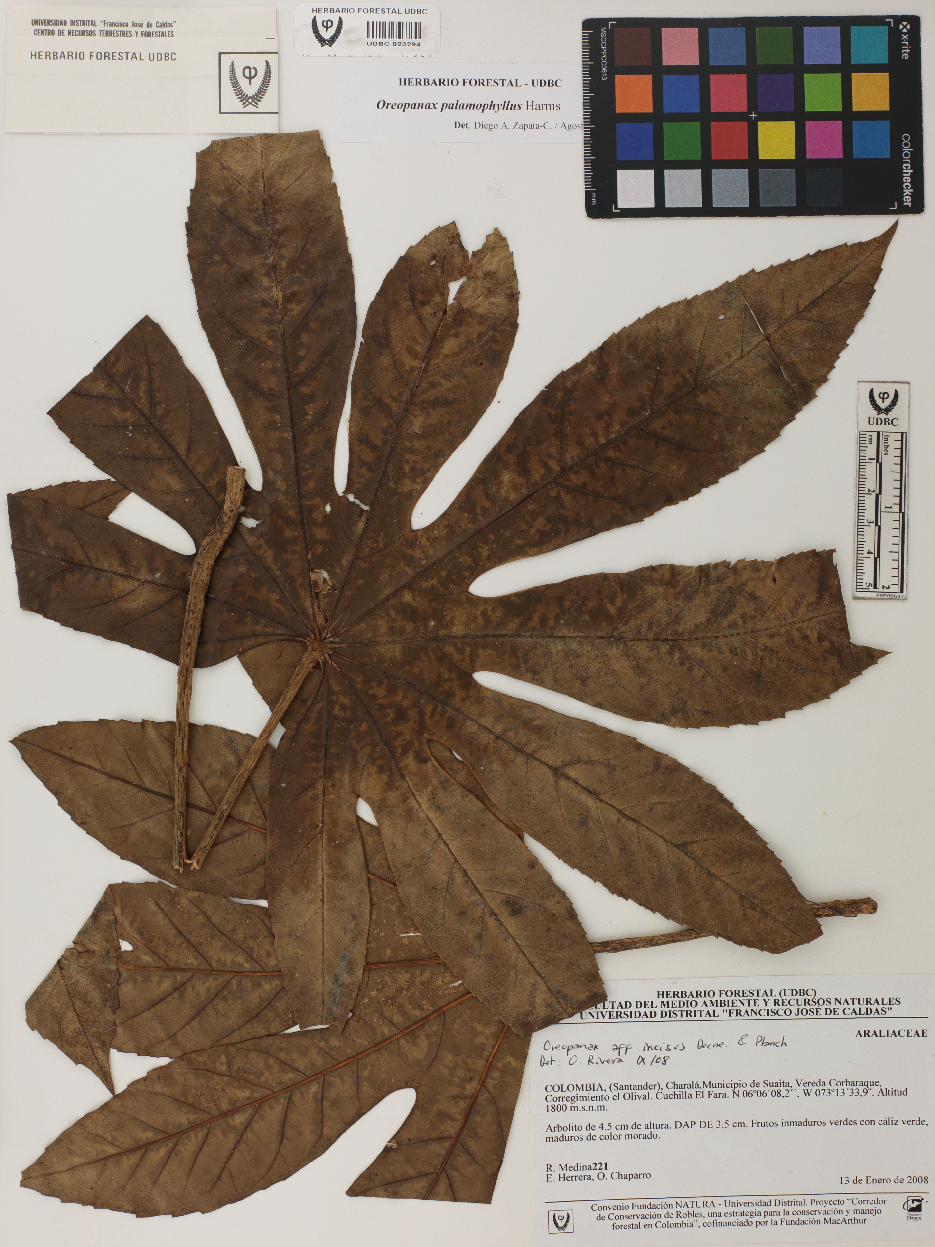 Fotografía del ejemplar Medina, R. 221, determinado como Oreopanax palamophyllus en el año 2022