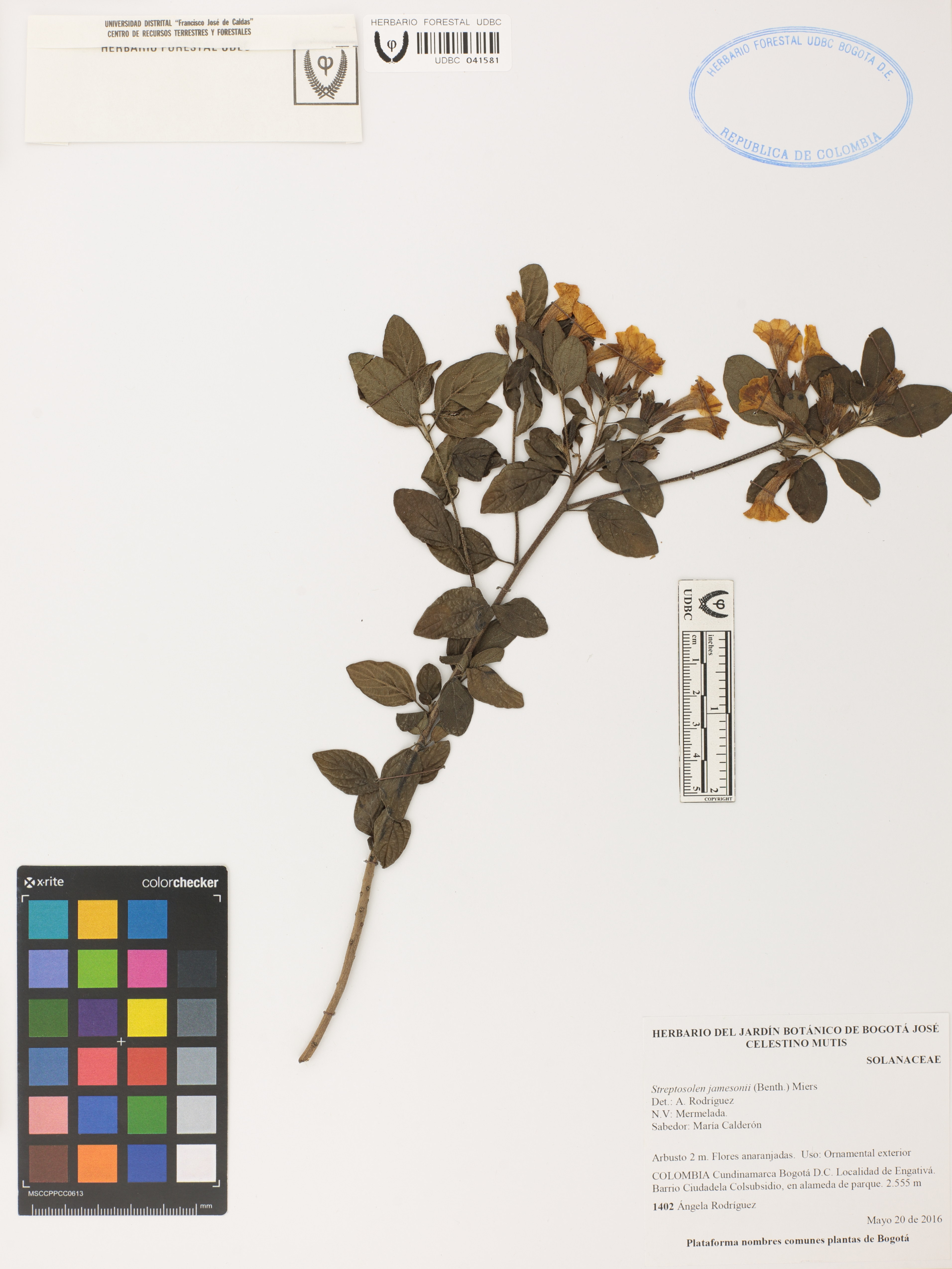 Fotografía del ejemplar Rodríguez, A. 1402, determinado como Streptosolen jamesonii en el año 2016