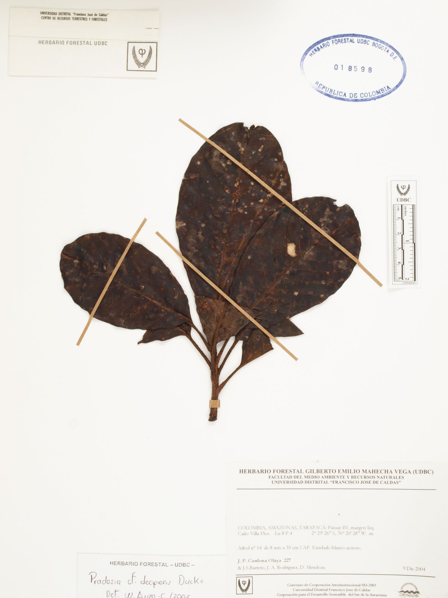 Fotografía del ejemplar Cardona, J. 227, determinado como Pradosia decipiens en el año 2005