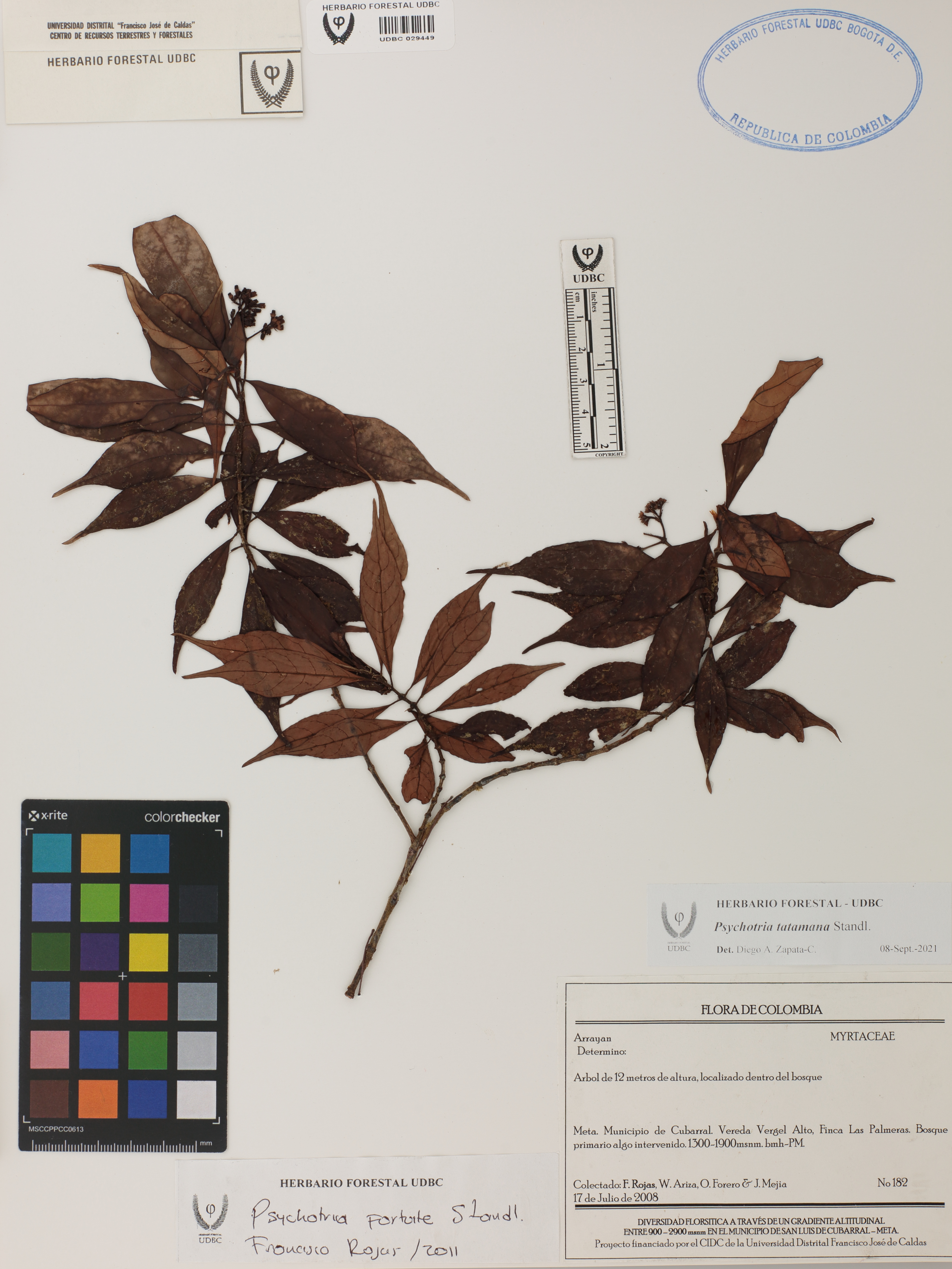 Fotografía del ejemplar Rojas, F. 182, determinado como Psychotria tatamana en el año 2021