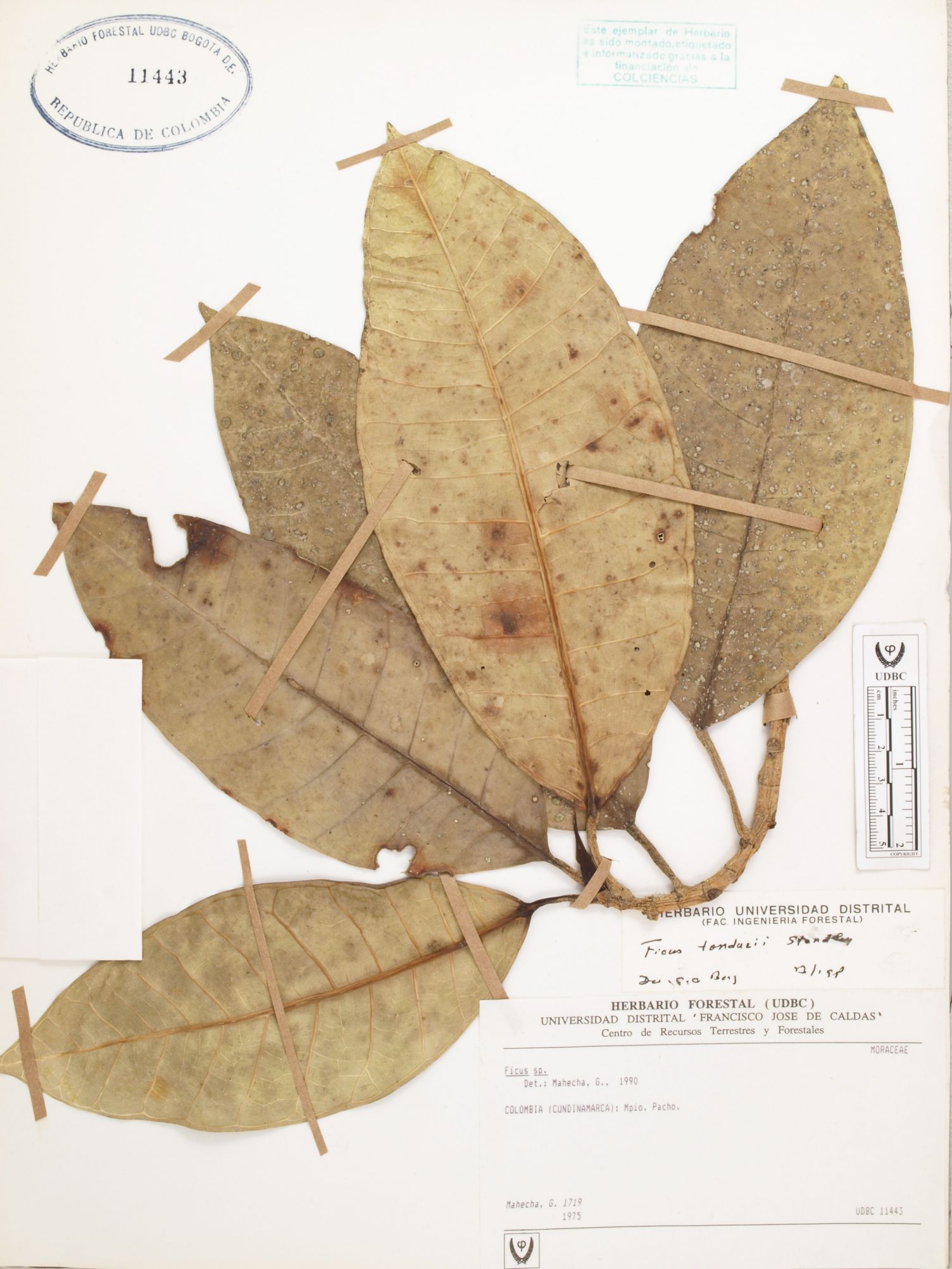 Fotografía del ejemplar Mahecha, G. 1719, determinado como Ficus tonduzii en el año 1997