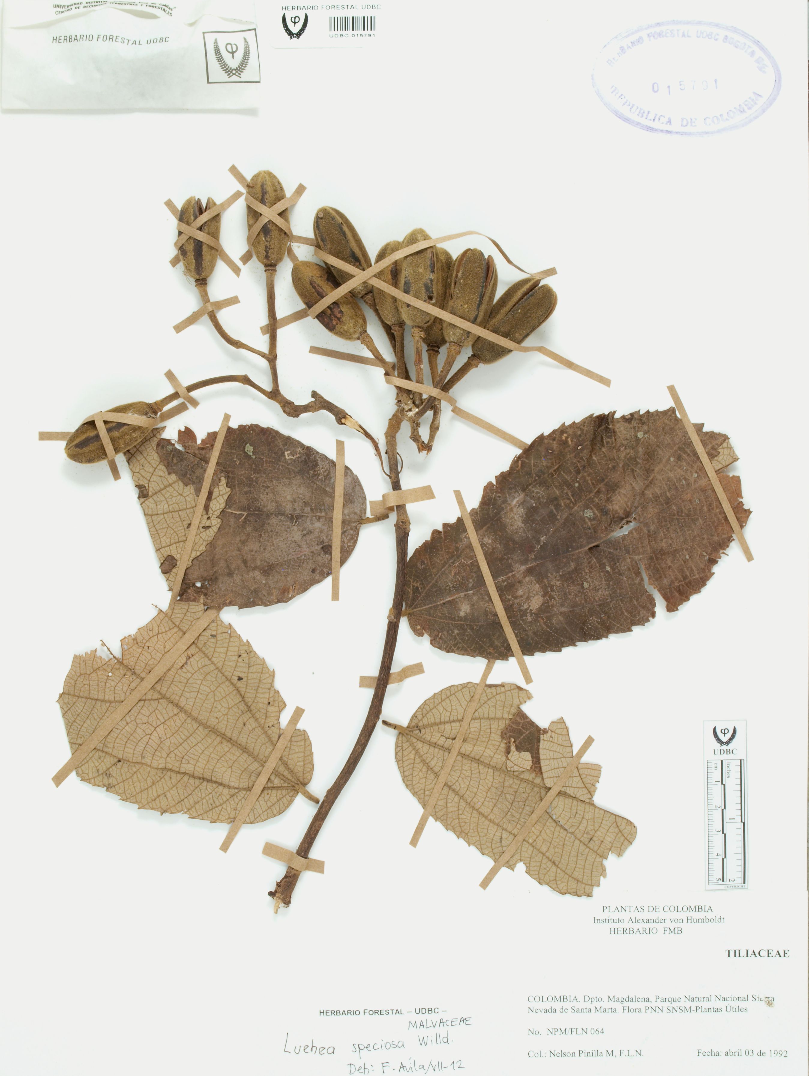 Fotografía del ejemplar Pinilla, N. 64, determinado como Luehea speciosa en el año 2012