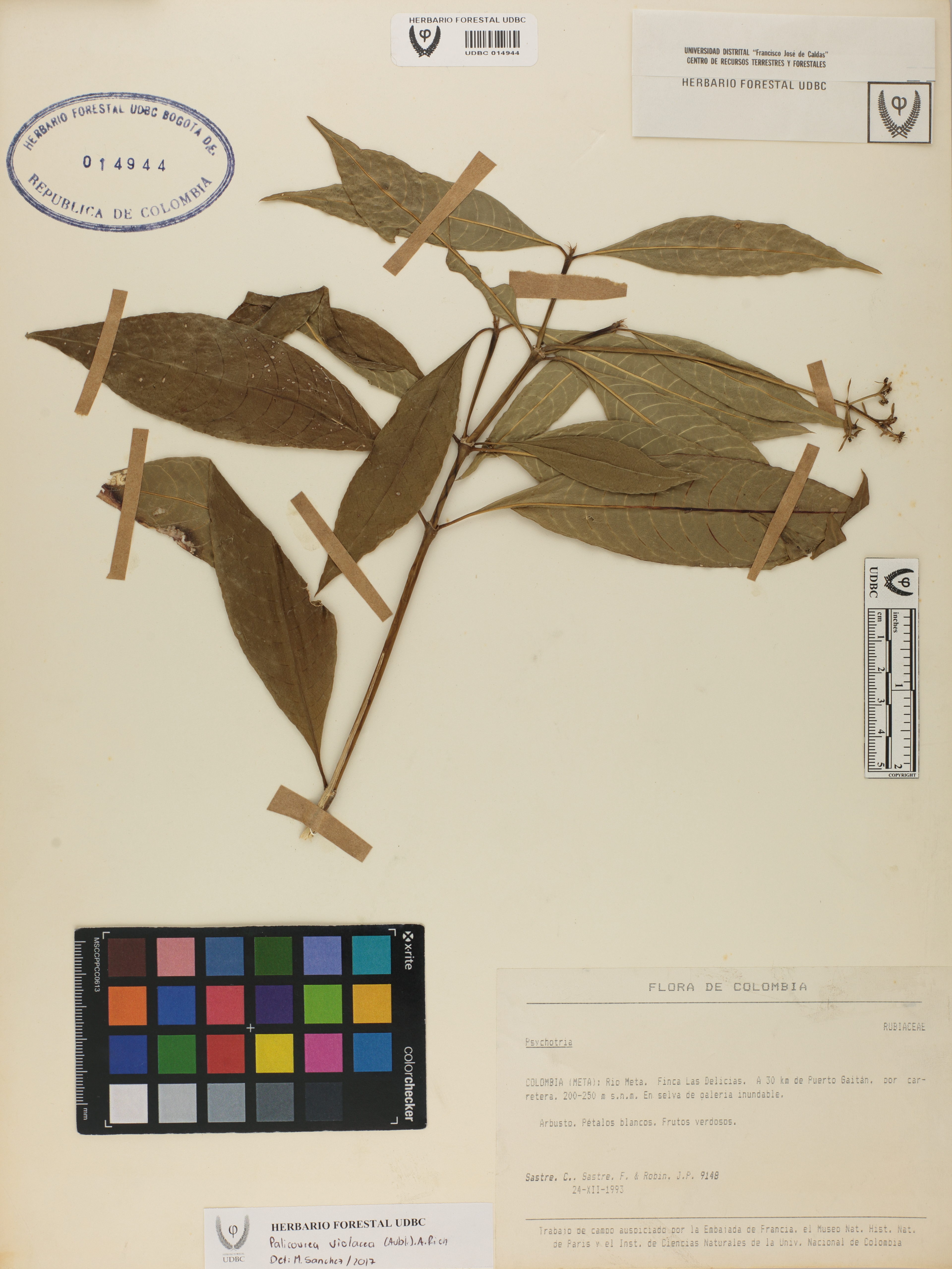 Fotografía del ejemplar Sastre, C. 9148, determinado como Palicourea violacea en el año 2017