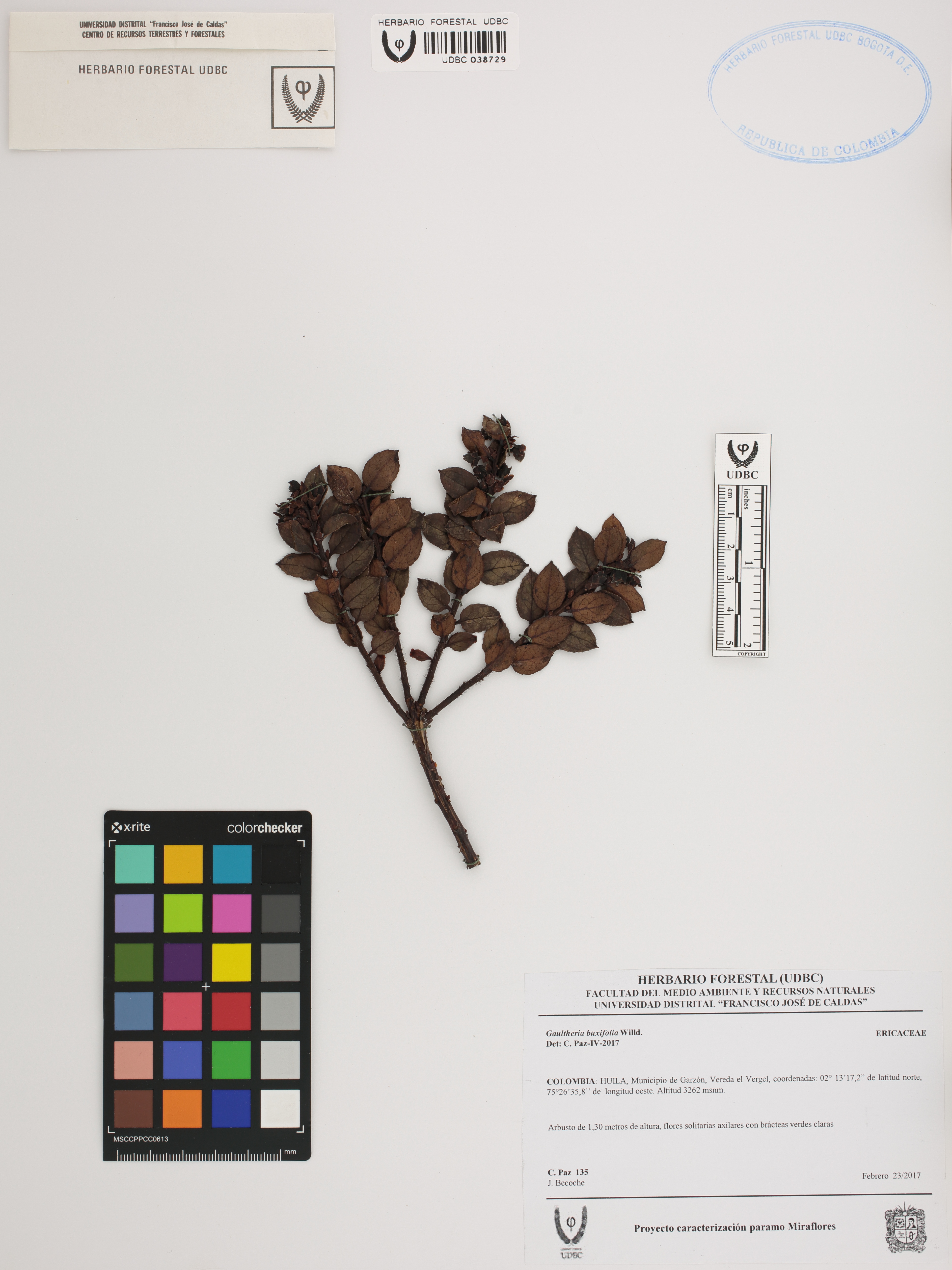 Fotografía del ejemplar Paz, C. 135, determinado como Gaultheria buxifolia en el año 2017