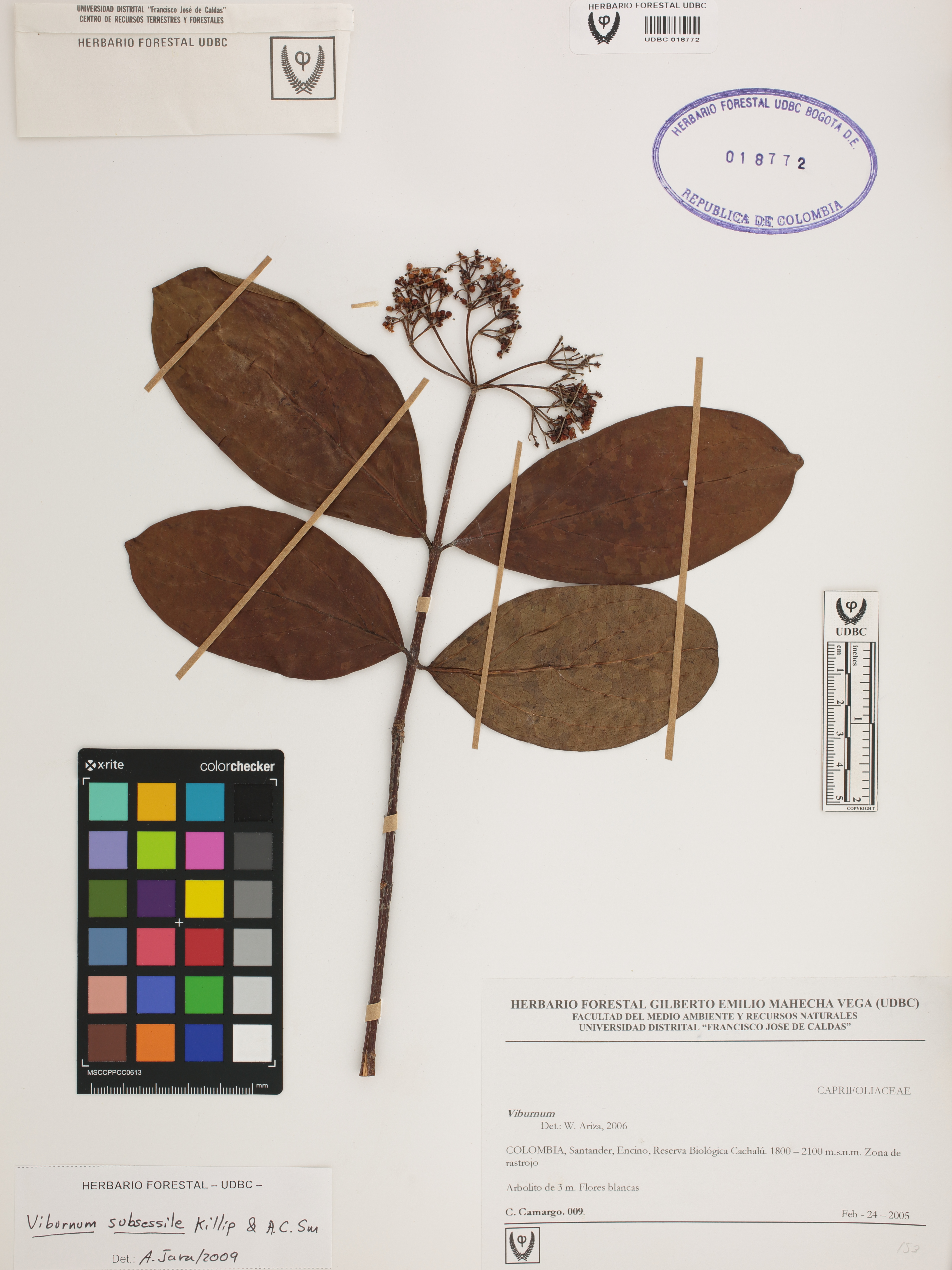 Fotografía del ejemplar Camargo, C. 9, determinado como Viburnum subsessile en el año 2009