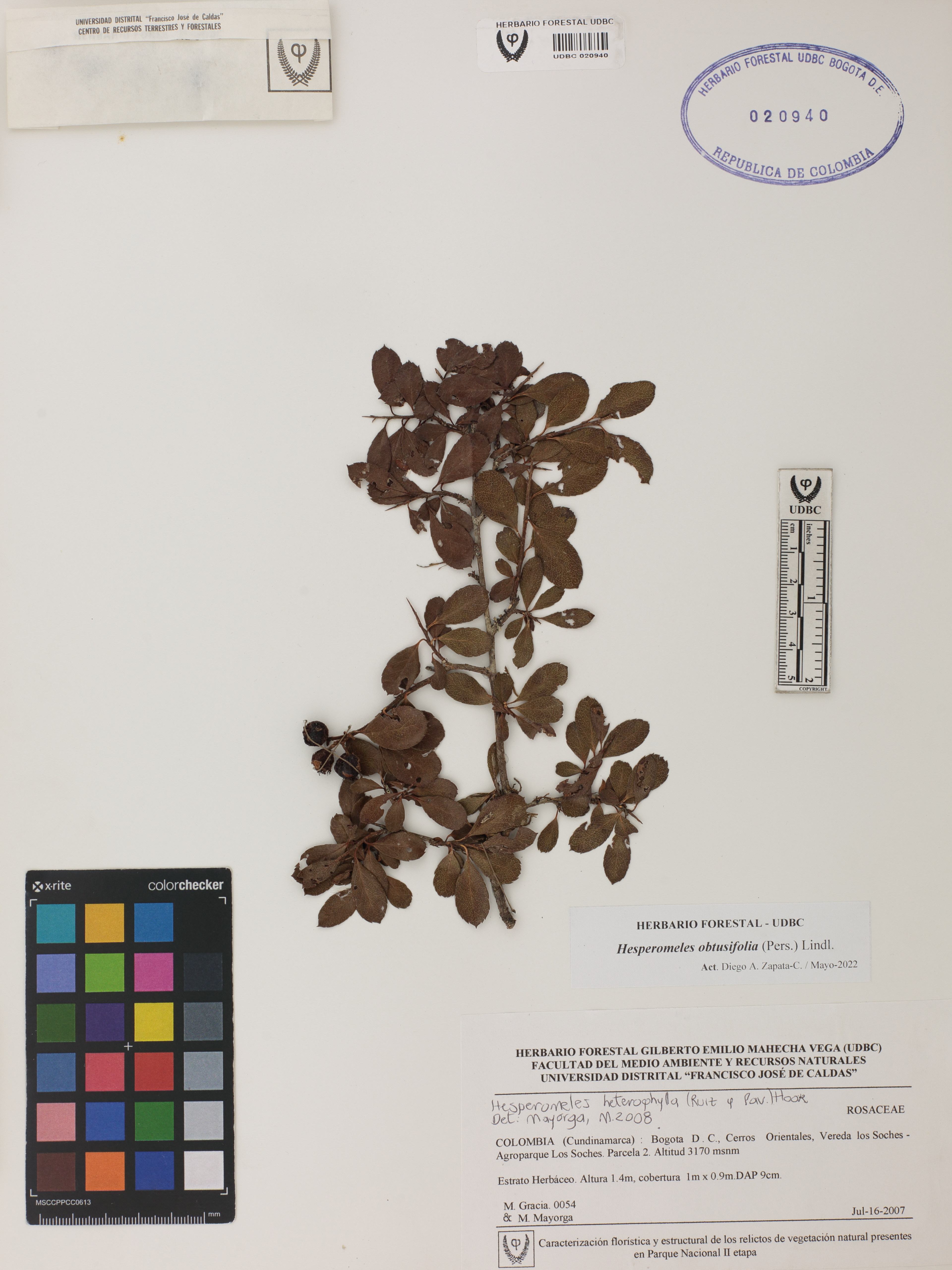 | dc.description | Fotografía del ejemplar Gracia, M. 54, determinado como Hesperomeles obtusifolia en el año 2008 | |