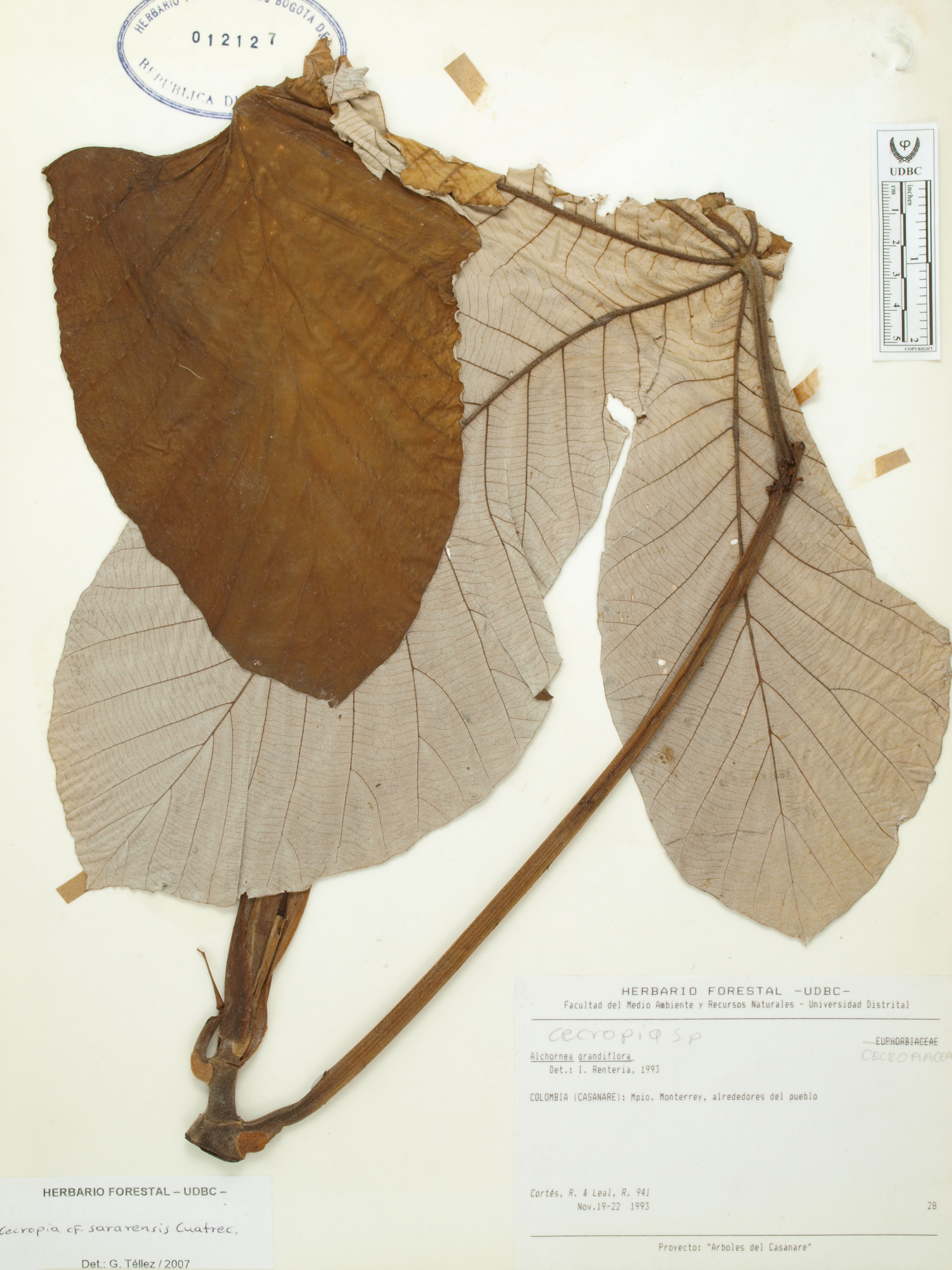 Fotografía del ejemplar Cortés-B., R. 941, determinado como Cecropia sararensis en el año 2007
