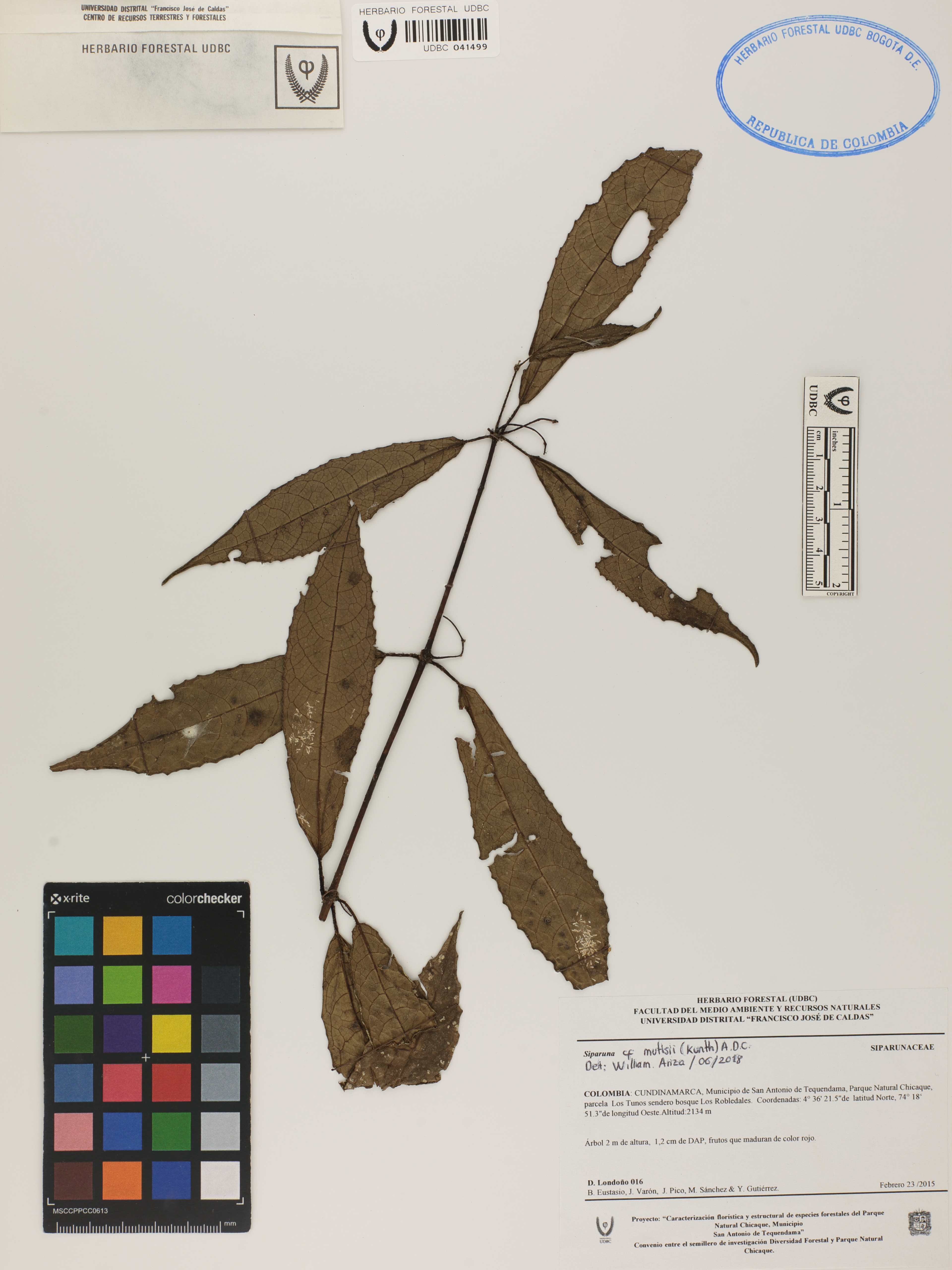 Fotografía del ejemplar Londoño, D. 16, determinado como Siparuna mutisii en el año 2018