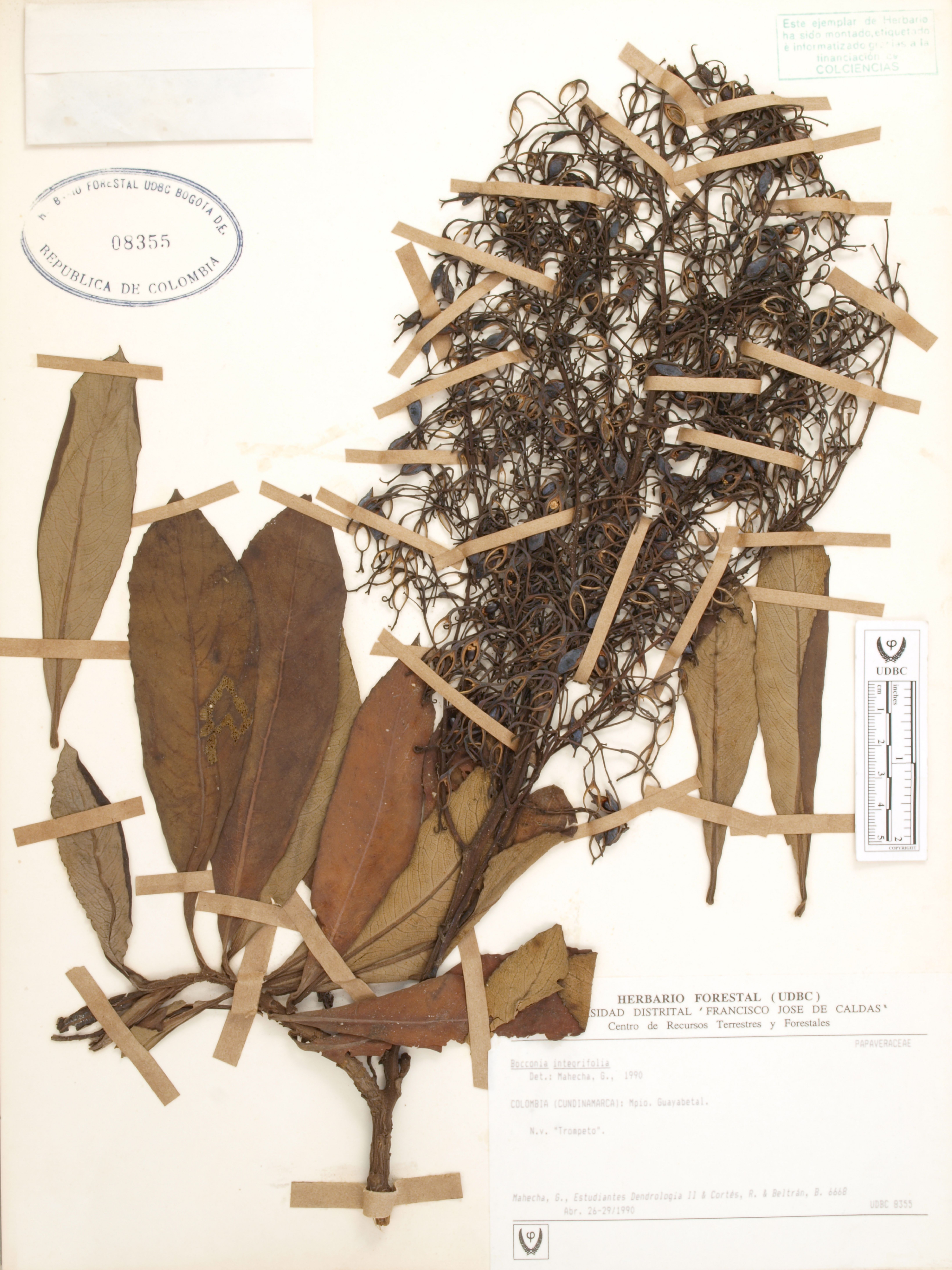 Fotografía del ejemplar Mahecha, G. 6668, determinado como Bocconia integrifolia en el año 1990
