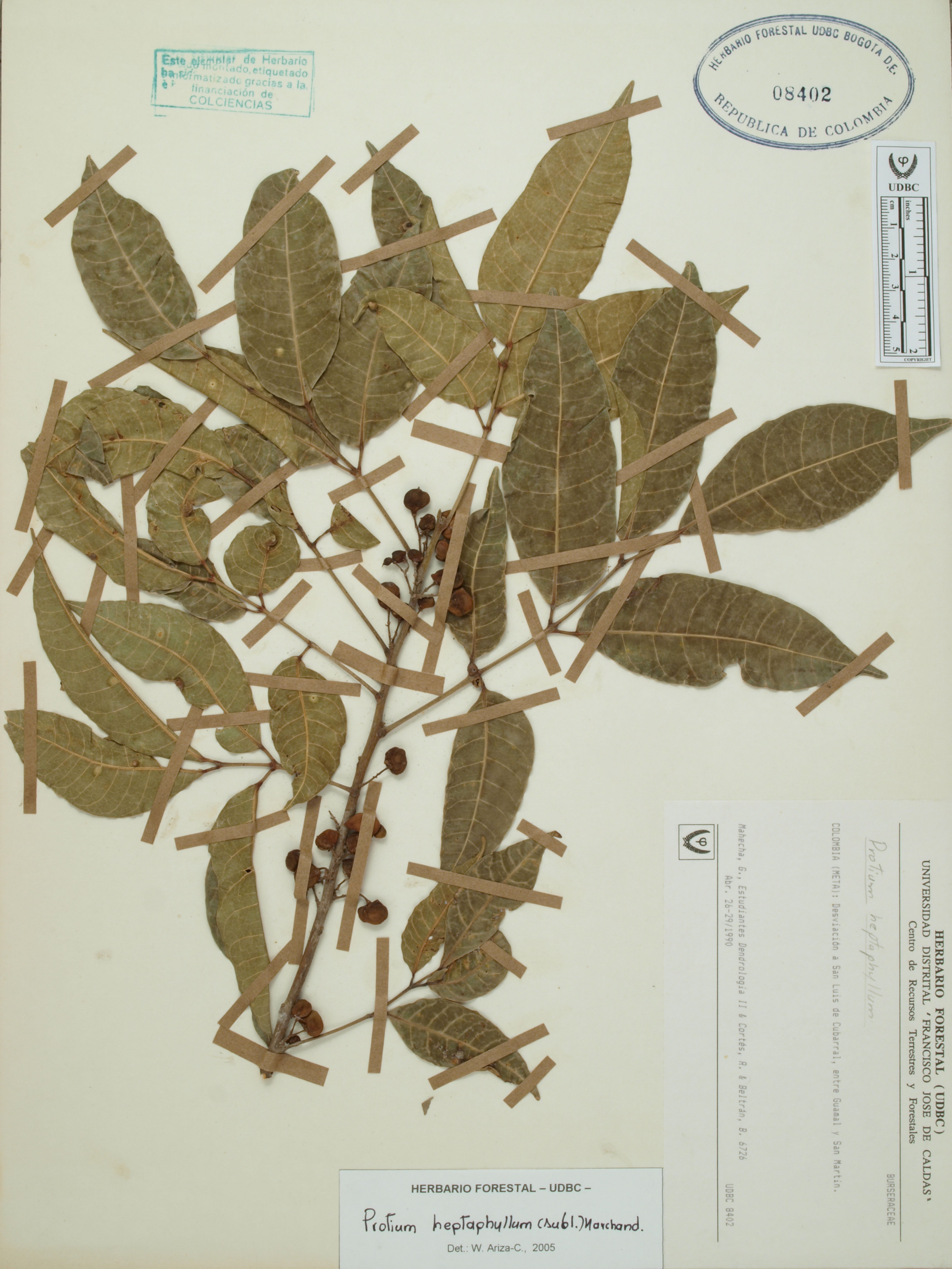 Fotografía del ejemplar Mahecha, G. 6726, determinado como Protium heptaphyllum en el año 2005