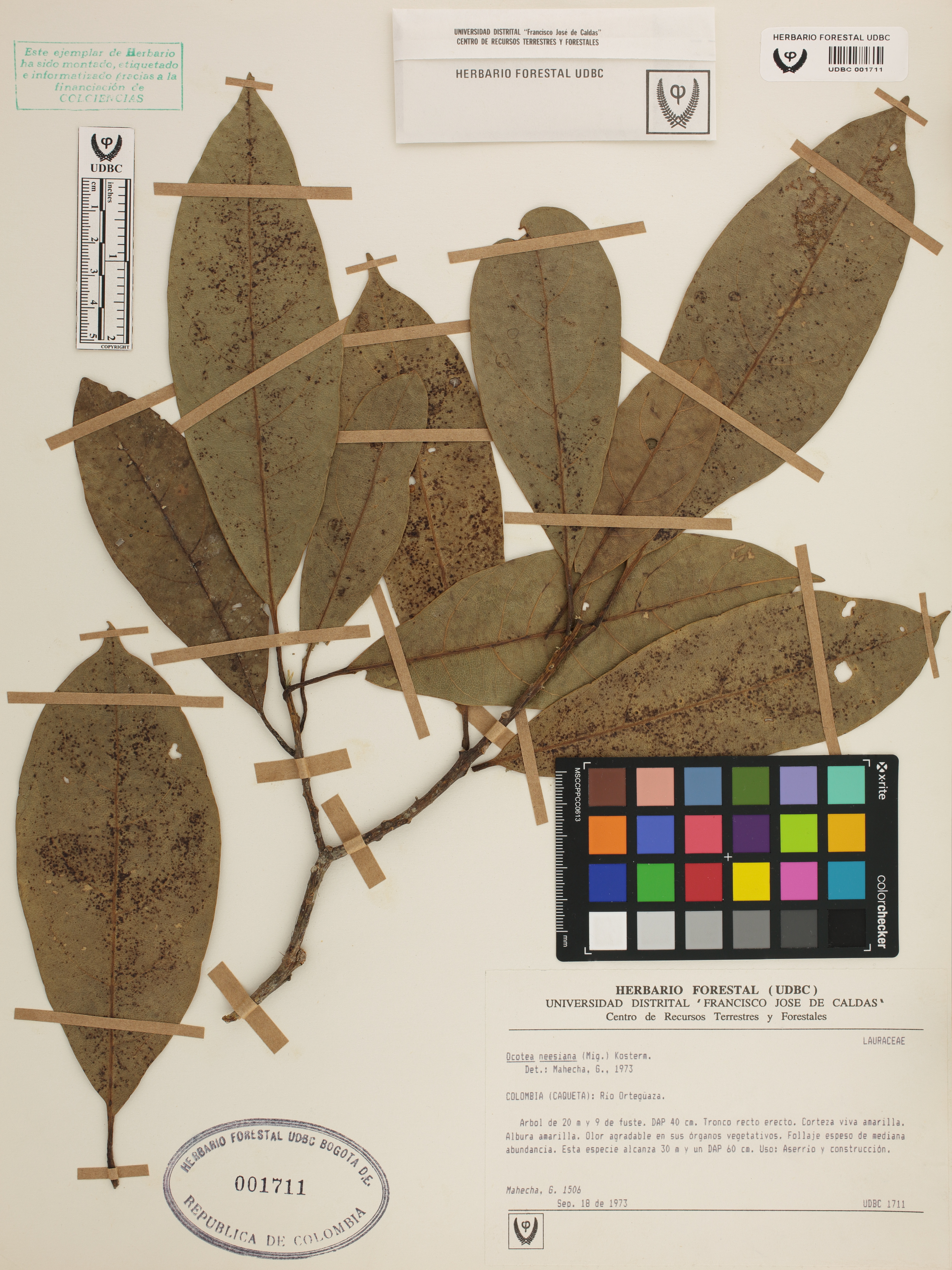 Fotografía del ejemplar Mahecha, G. 1506, determinado como Ocotea neesiana en el año 1973