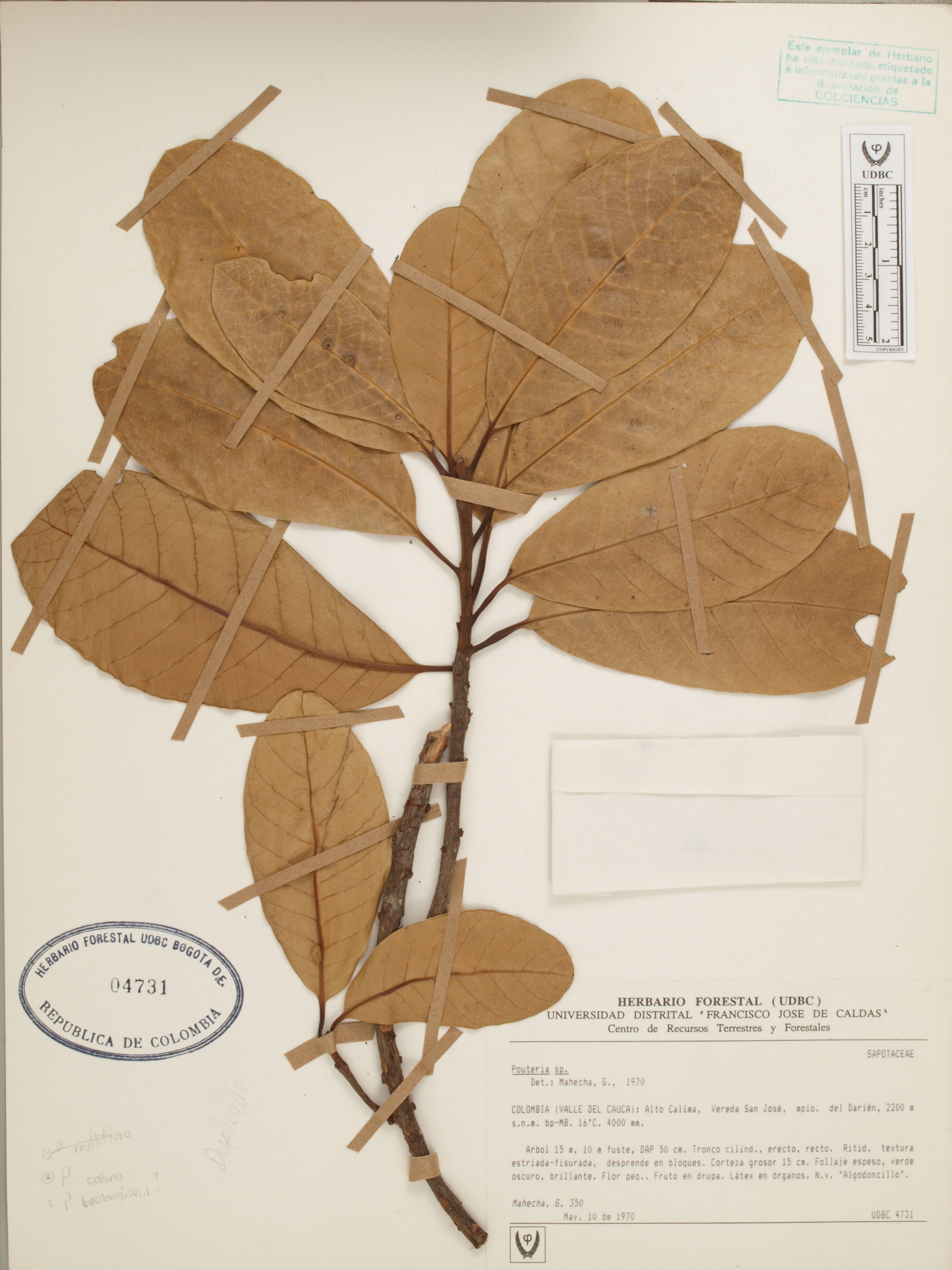 Fotografía del ejemplar Mahecha, G. 350, determinado como Pouteria sp. en el año 1970