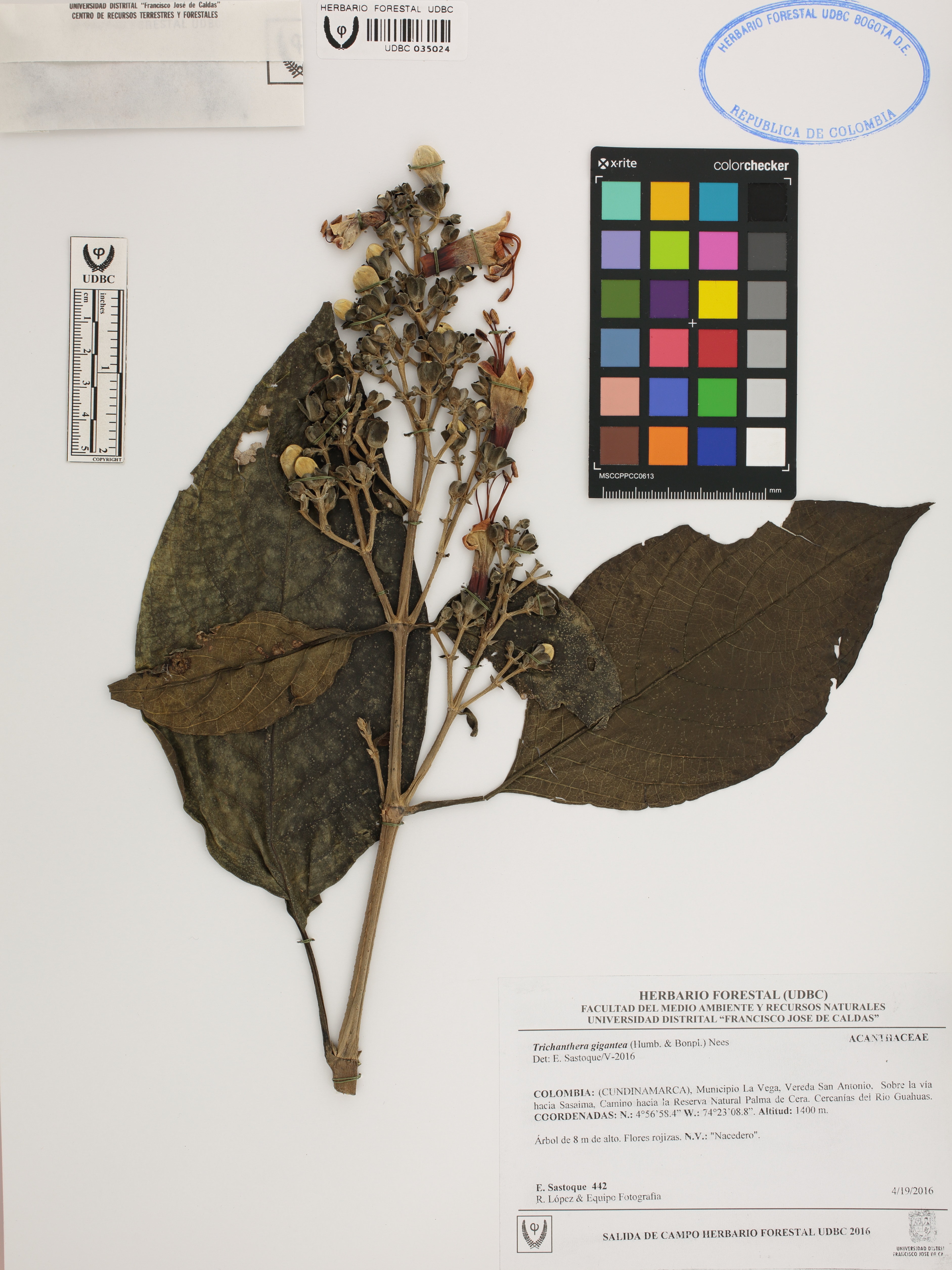 Fotografía del ejemplar Sastoque, E. 442, determinado como Trichanthera gigantea en el año 2016