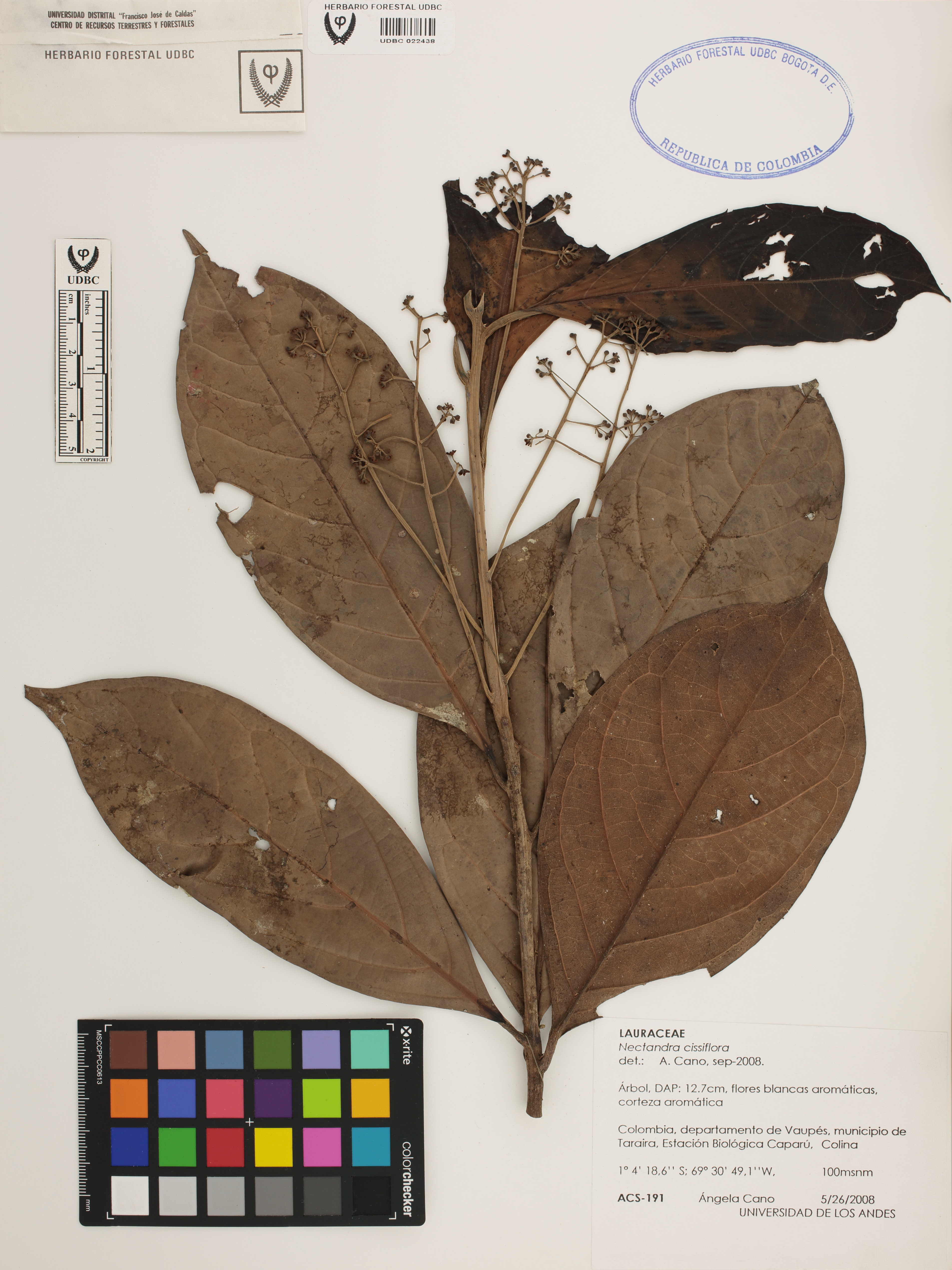 Fotografía del ejemplar Cano, A. 191, determinado como Nectandra cissiflora en el año 2008