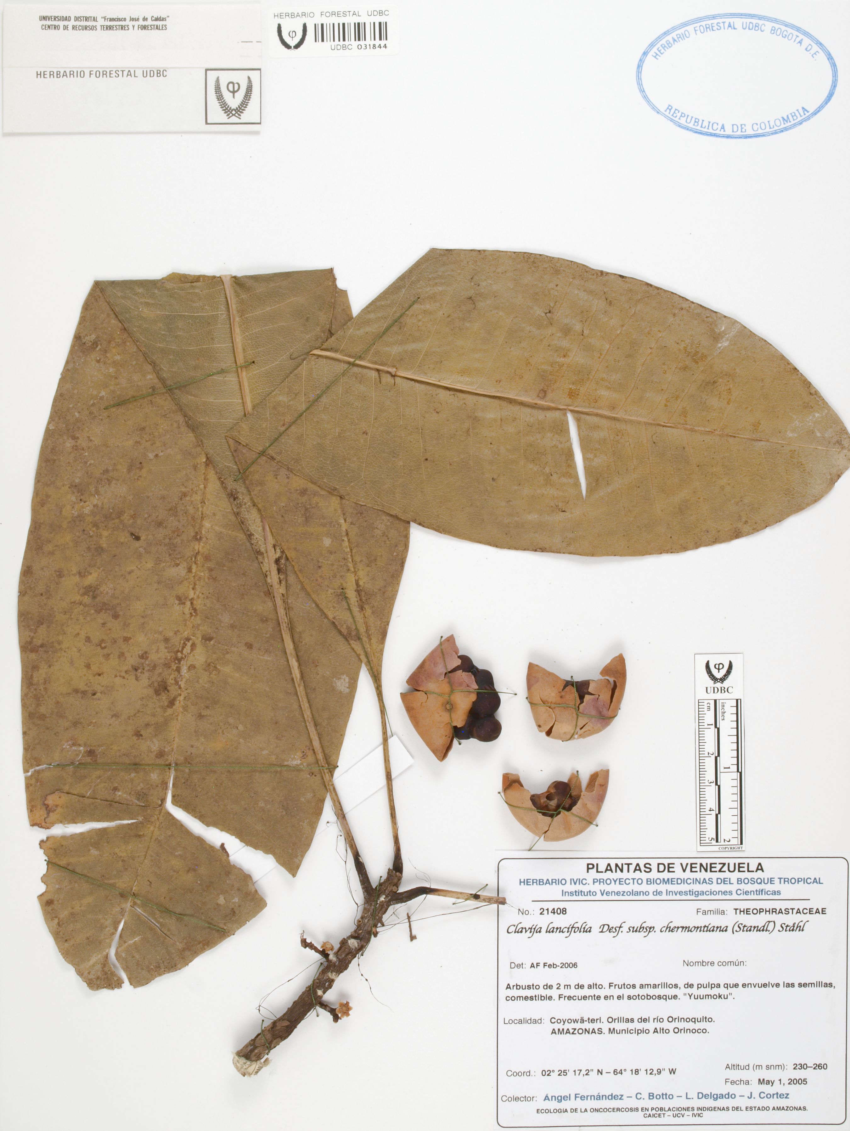 Fotografía del ejemplar Fernández, A. 21408, determinado como Clavija lancifolia subsp. chermontiana en el año 2006