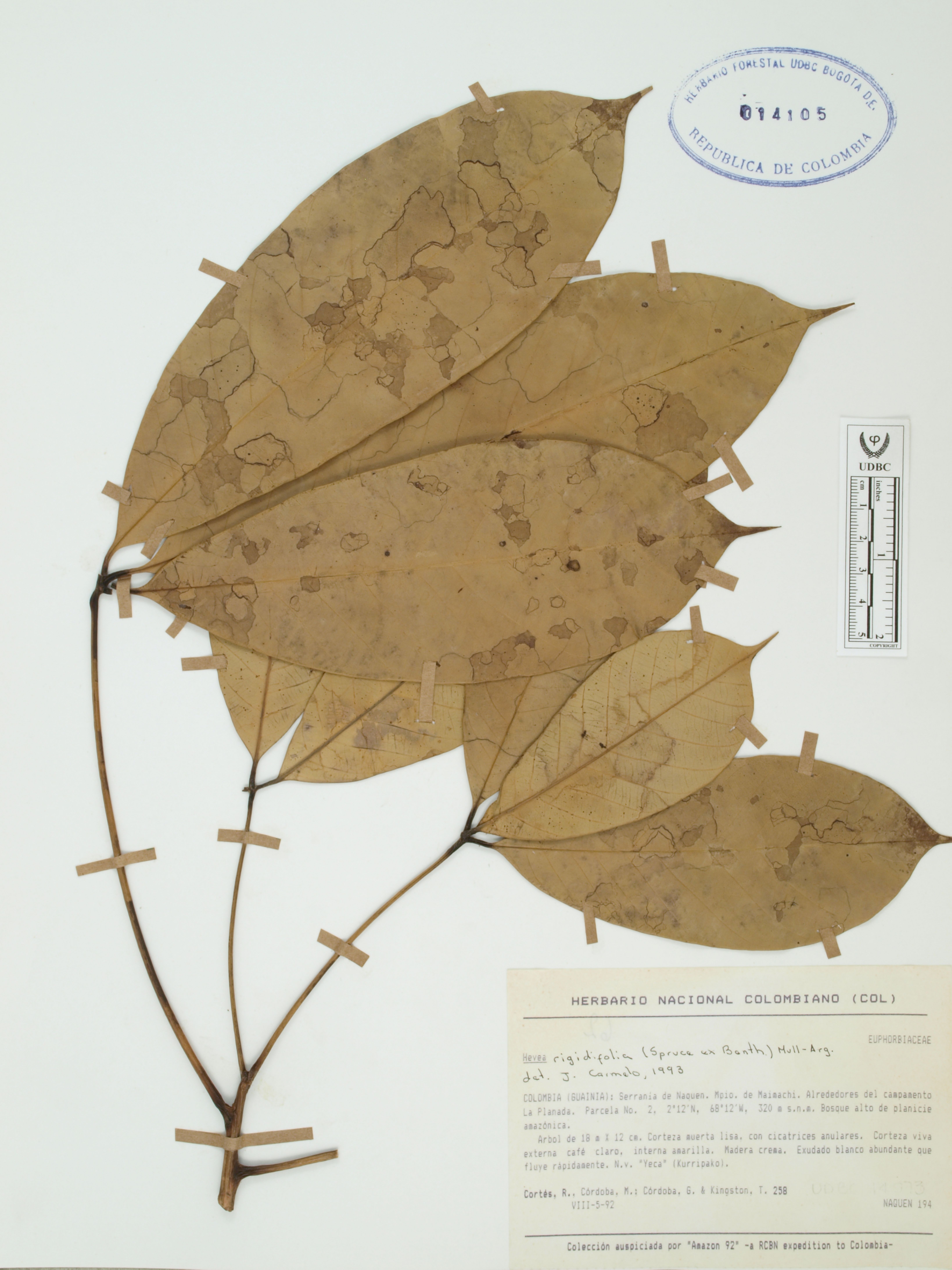 | dc.description | Fotografía del ejemplar Cortés-B., R. 258, determinado como Hevea rigidifolia en el año 1993 | |