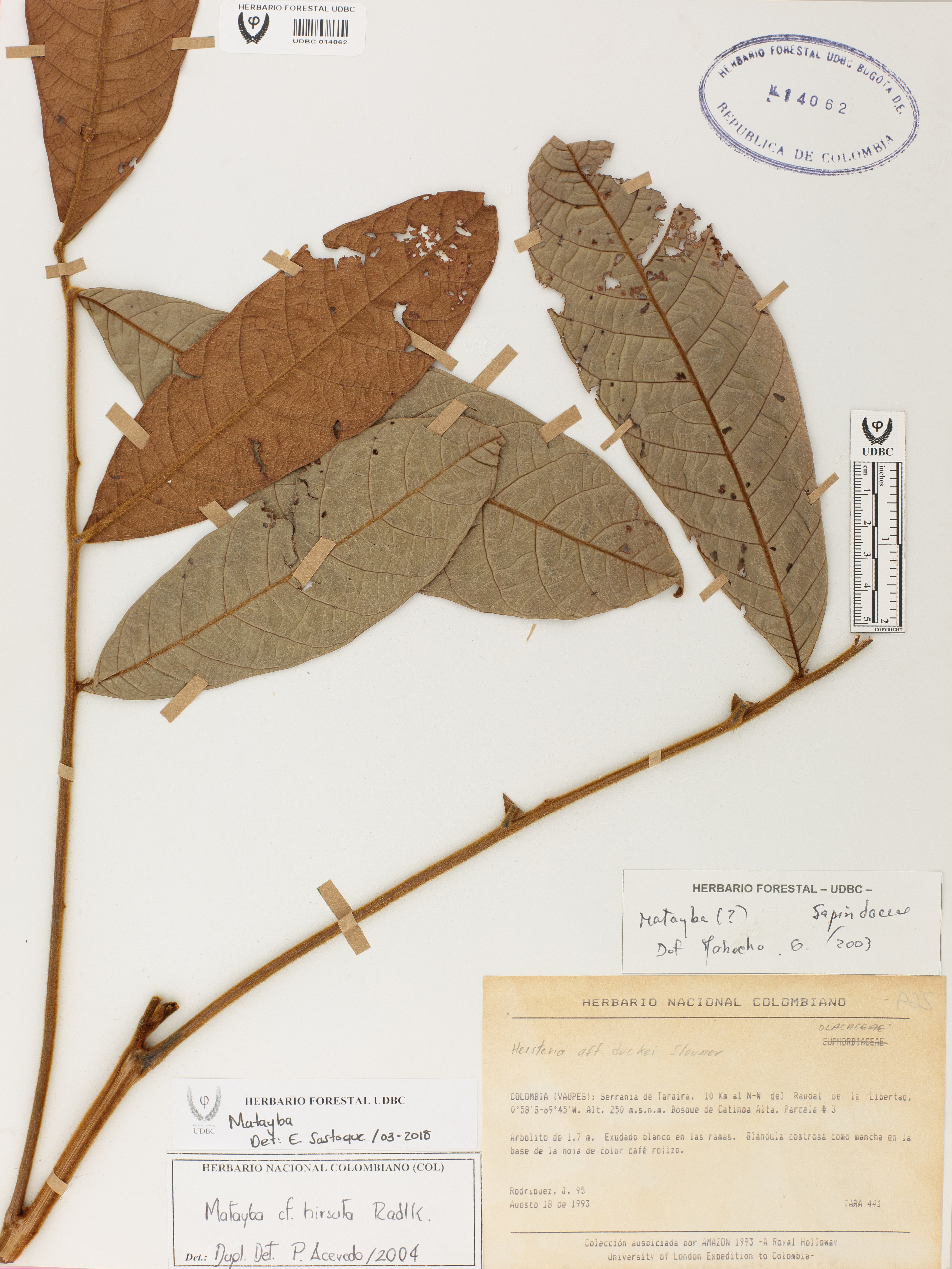 Fotografía del ejemplar Rodríguez, J. 95, determinado como Matayba sp. en el año 2018
