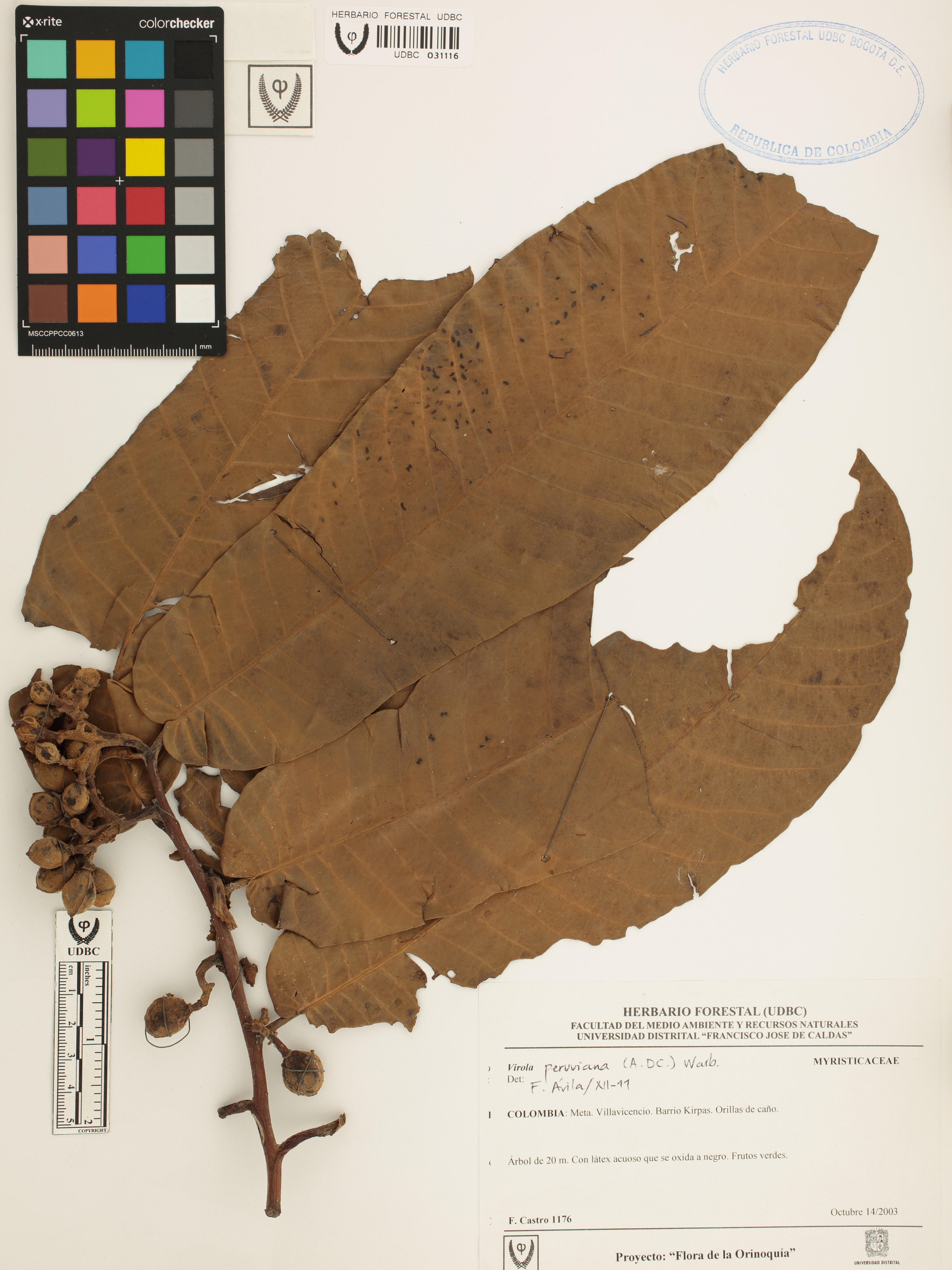 Fotografía del ejemplar Castro, F. 1176, determinado como Virola peruviana en el año 2011