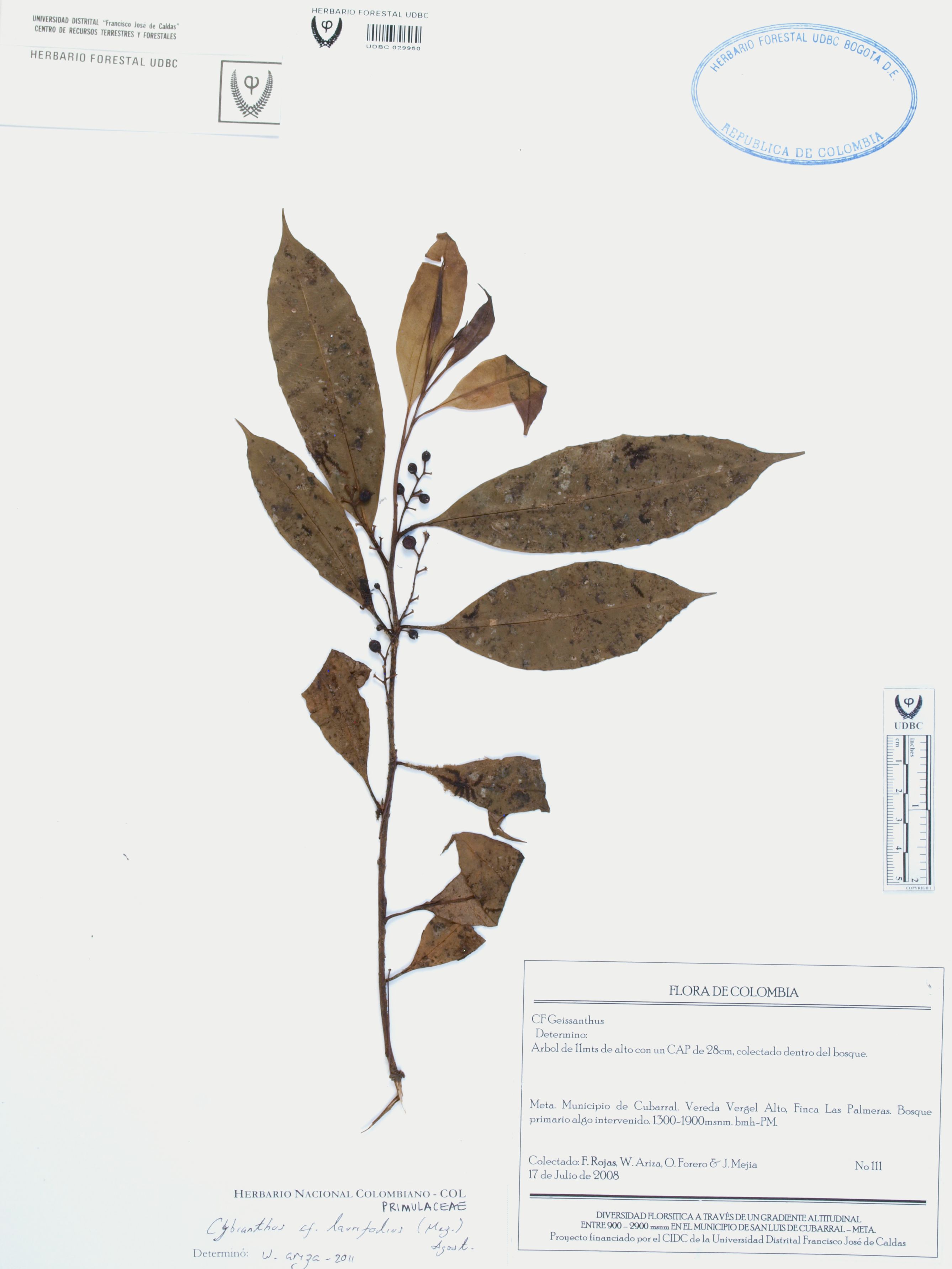 | dc.description | Fotografía del ejemplar Rojas, F. 111, determinado como Cybianthus laurifolius en el año 2011 | |